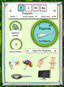 The 26 elements represented in the Dragon book are: Antimony, Bismuth, Carbon, Europium, Francium, Gallium, Hydrogen, Indium, Neon, Chlorine, Lithium, Molybdenum, Nitrogen, Oxygen, Platinum, Ruthenium, Sodium, Titanium, Lutetium, Calcium, Sulfur, Yttrium and Zirconium along with Hydrogen Isotope – Deuterium. Also included is the Quicklime – a compound of Calcium and Oxygen. The alloy, White Gold is also represented.
