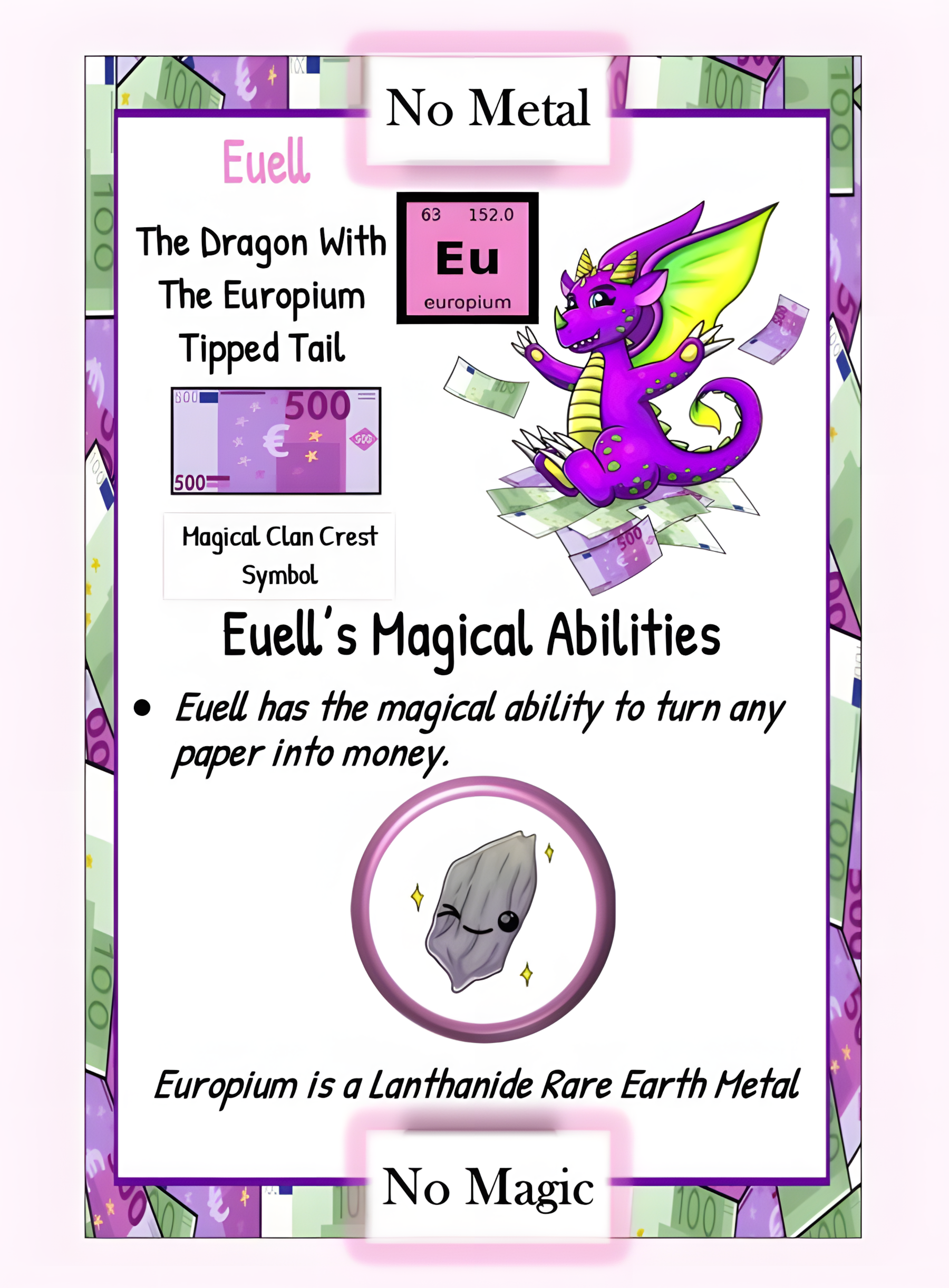 This article is brought to you by Sybrina Durant, the author of the middle grade picture book, Magical Elements of the Periodic Table Presented Alphabetically By The Elemental Dragons. Learn More. In that book Europium is presented by the dragon, Euell.
