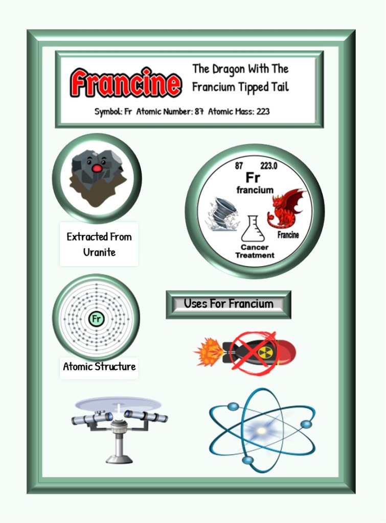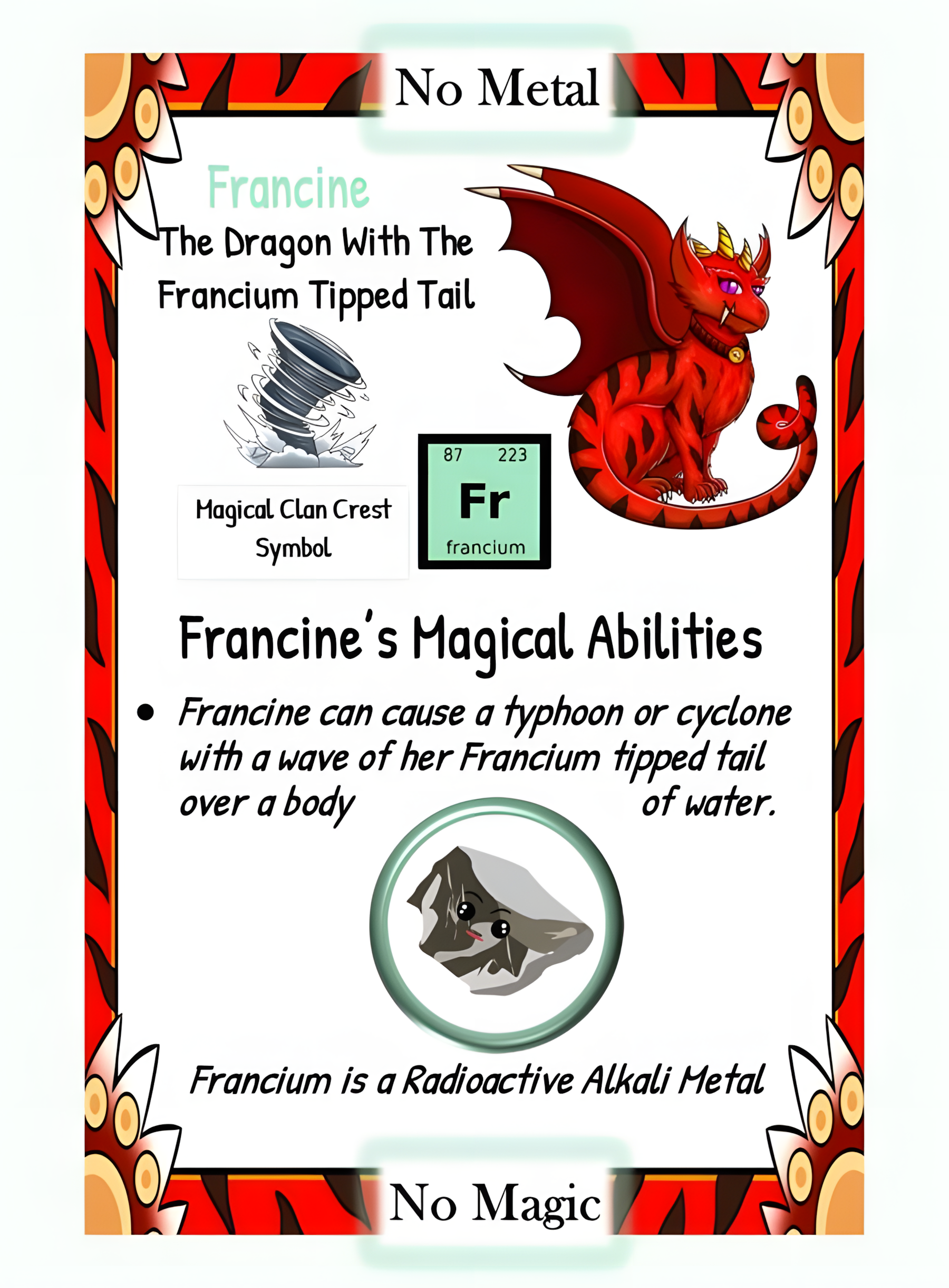 This article is brought to you by Sybrina Durant, the author of the middle grade picture book, Magical Elements of the Periodic Table Presented Alphabetically By The Elemental Dragons. Learn More. In that book francium is presented by the dragon, Francine.