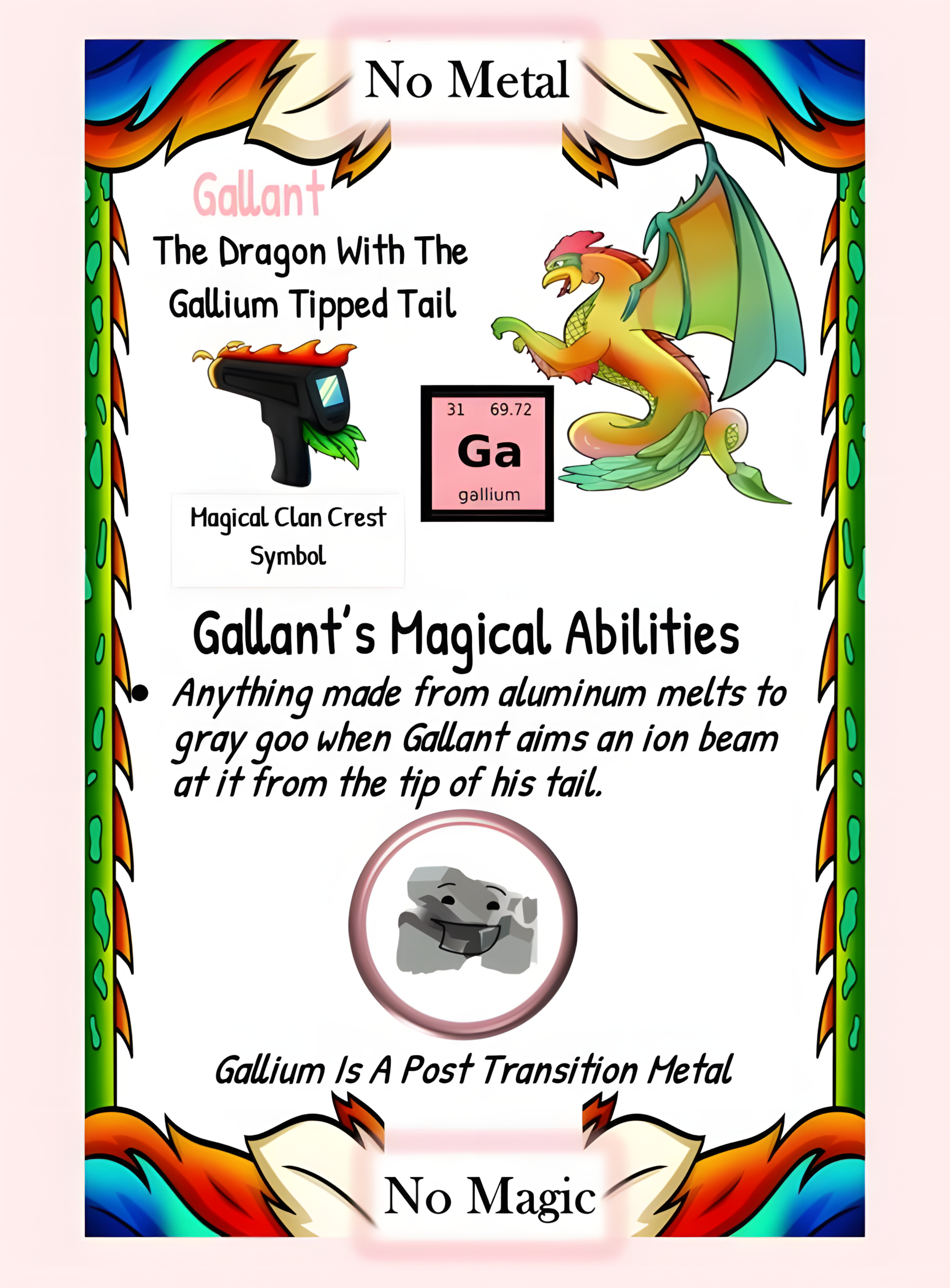 This article is brought to you by Sybrina Durant, the author of the middle grade picture book, Magical Elements of the Periodic Table Presented Alphabetically By The Elemental Dragons. Learn More. In that book Gallium is presented by the dragon, Gallant.