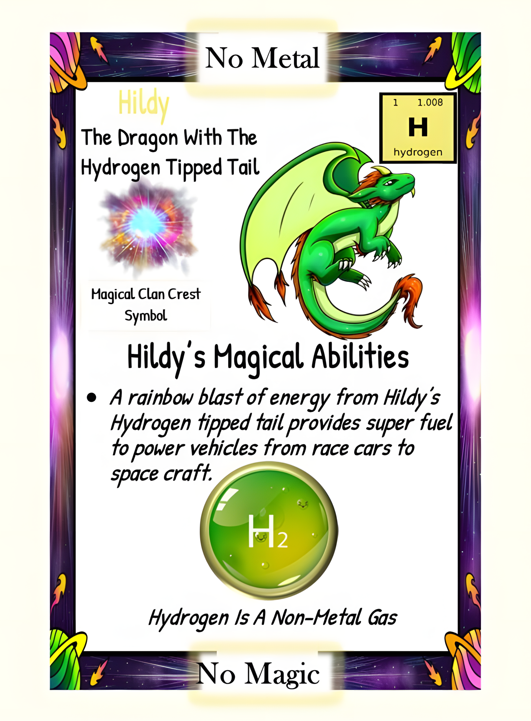 This article is brought to you by Sybrina Durant, the author of the middle grade picture book, Magical Elements of the Periodic Table Presented Alphabetically By The Elemental Dragons. Learn More. In that book hydrogen is presented by the dragon, Hildy.