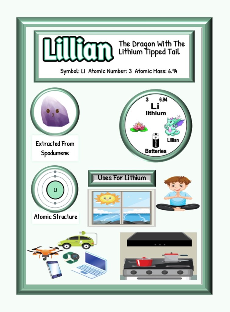 This article is brought to you by Sybrina Durant, the author of the middle grade picture book, Magical Elements of the Periodic Table Presented Alphabetically By The Elemental Dragons. Learn More. In that book Lithium is presented by the dragon, Lillian.