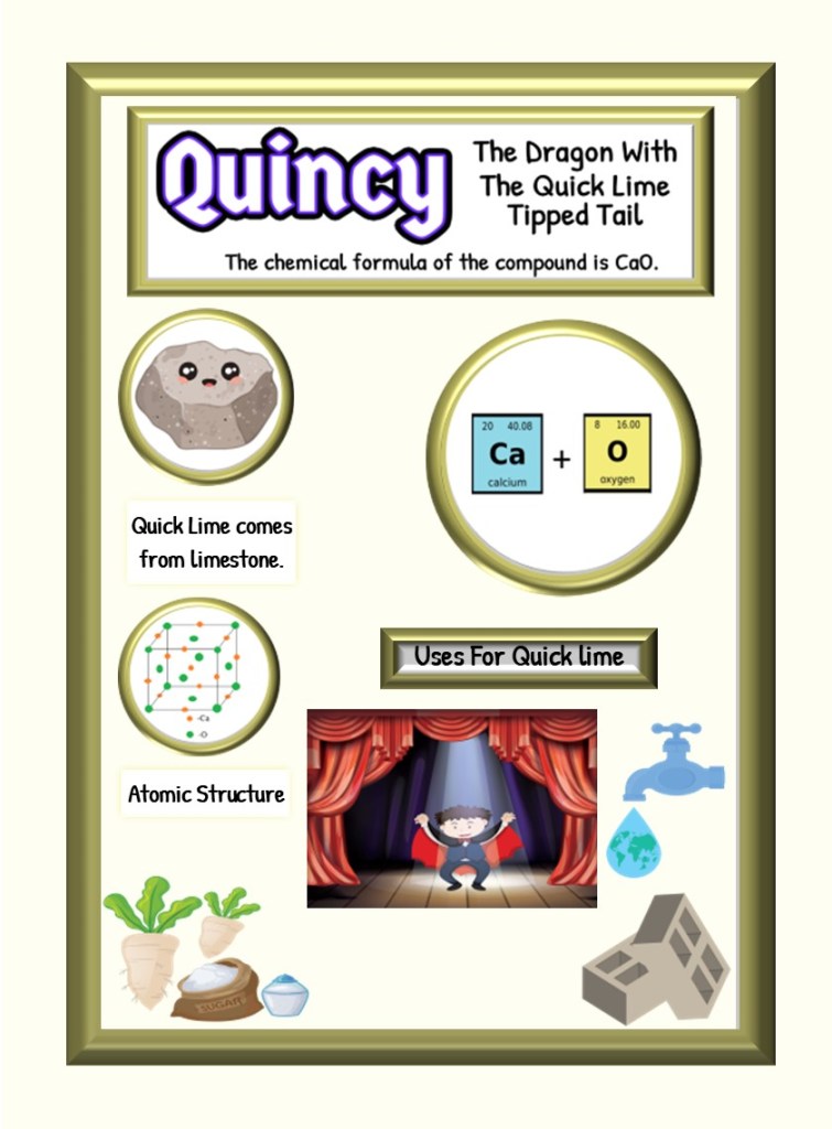 This article is brought to you by Sybrina Durant, the author of the middle grade picture book, Magical Elements of the Periodic Table Presented Alphabetically By The Elemental Dragons. Learn More. In that book Quicklime is presented by the dragon, Quincy.