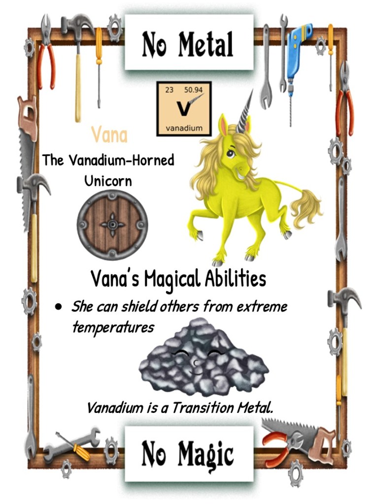 This article is brought to you by Sybrina Durant, the author of the middle grade picture book, Magical Elements of the Periodic Table Presented Alphabetically By The Elemental Unicorns. Learn More. In that book Vanadium is presented by the unicorn, Vana.