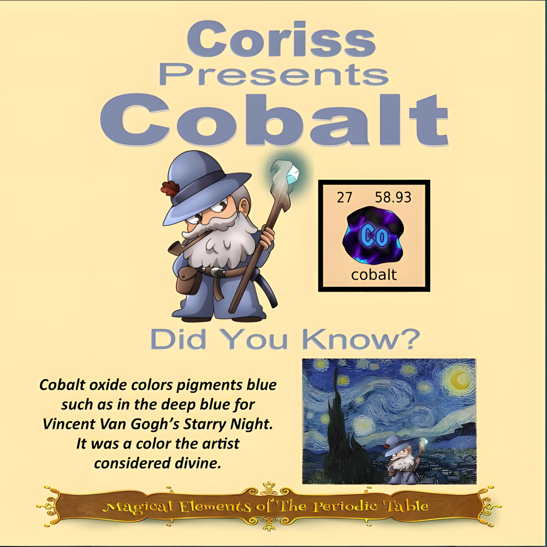 This article is brought to you by Sybrina Durant, the author of the middle grade picture book, Magical Elements of the Periodic Table Presented Alphabetically By The Elemental Wizards. Learn More. In that book Cobalt is presented by the Wizard, Coriss.