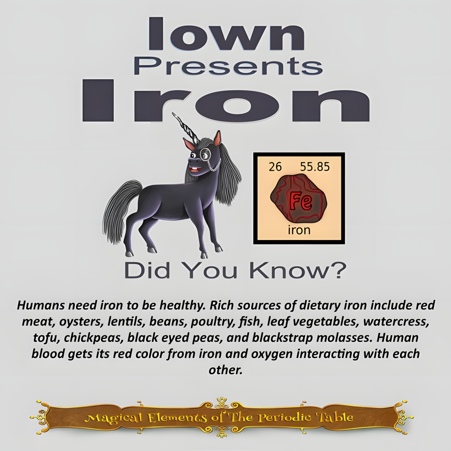 This article is brought to you by Sybrina Durant, the author of the middle grade picture book, Magical Elements of the Periodic Table Presented Alphabetically By The Metal Horn Unicorns. Learn More. In that book Iron is presented by the unicorn, Iown.