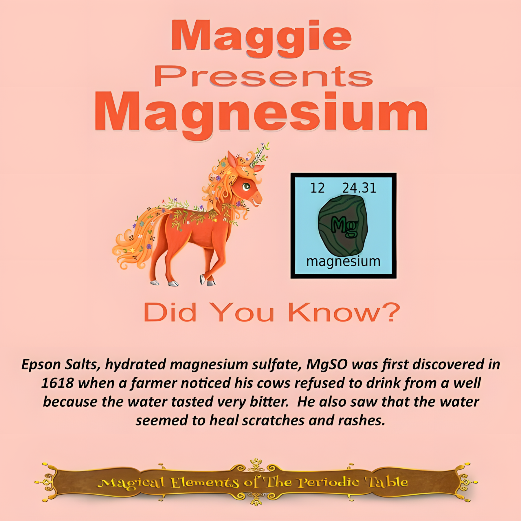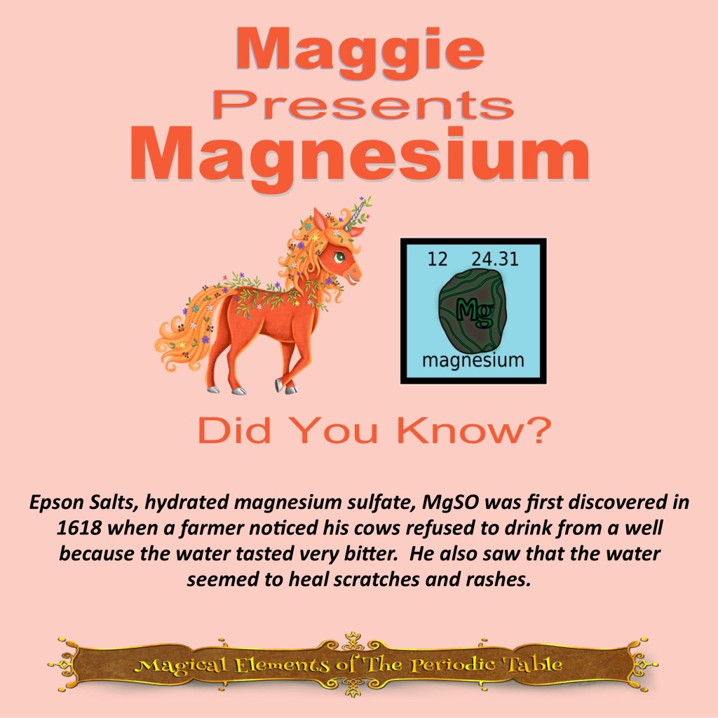 This article is brought to you by Sybrina Durant, the author of the middle grade picture book, Magical Elements of the Periodic Table Presented Alphabetically By The Metal Horn Unicorns. Learn More. In that book Magnesium is presented by the unicorn, Maggie.