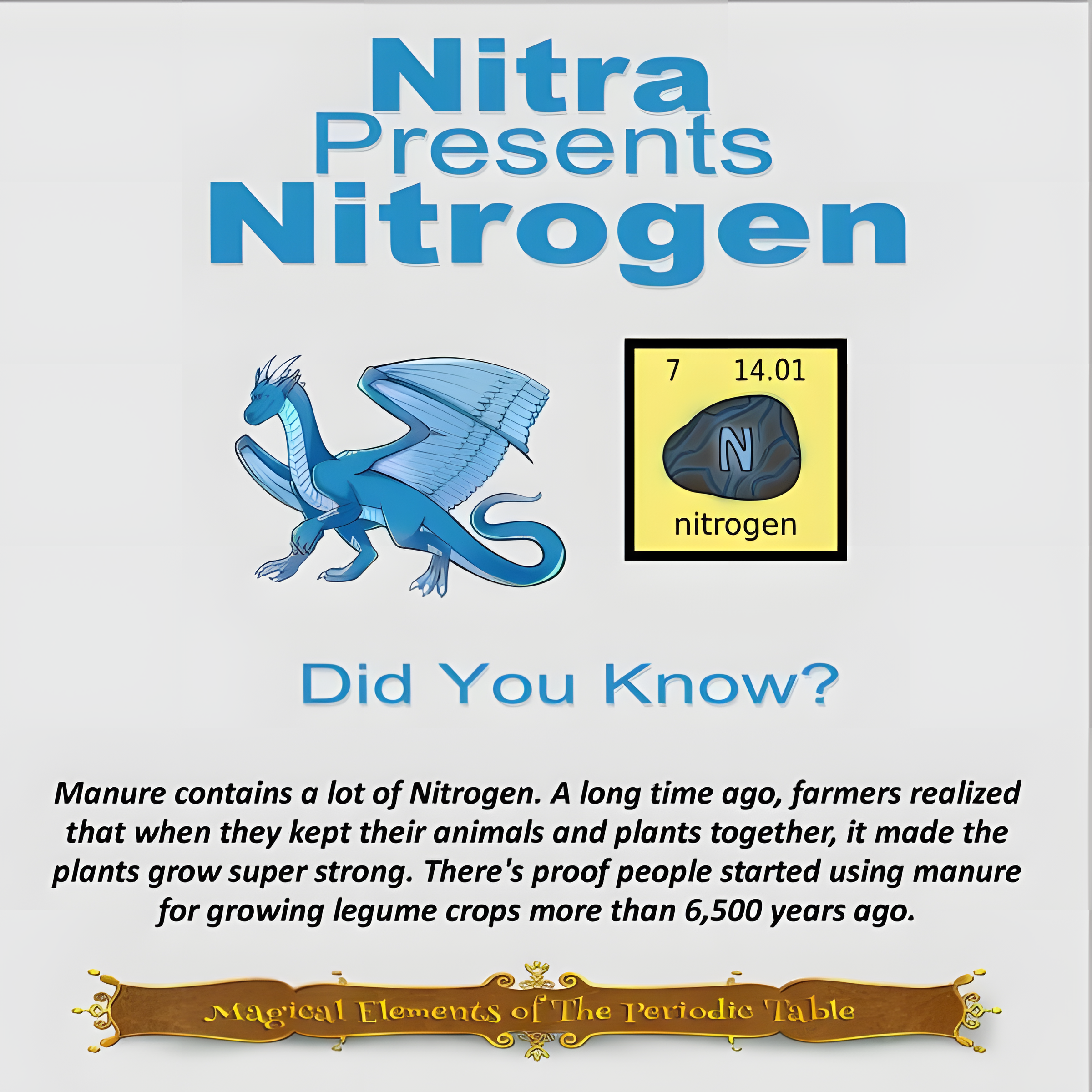 Nitra Presents Nitrogen – Did You Know? Manure contains a lot of Nitrogen. A long time ago, farmers realized that when they kept their animals and plants together, it made the plants grow super strong. There’s proof people started using manure for growing legume crops more than 6,500 years ago.