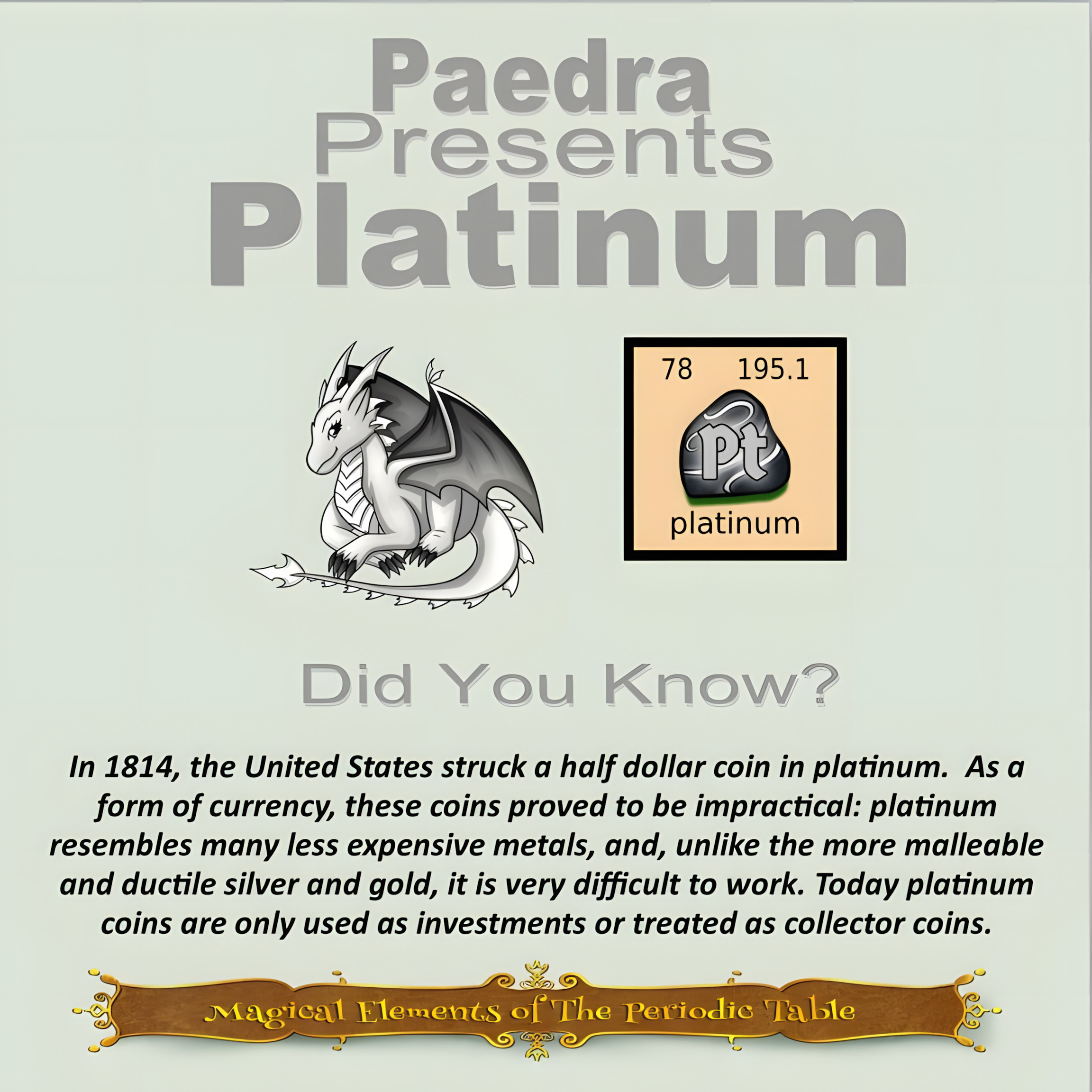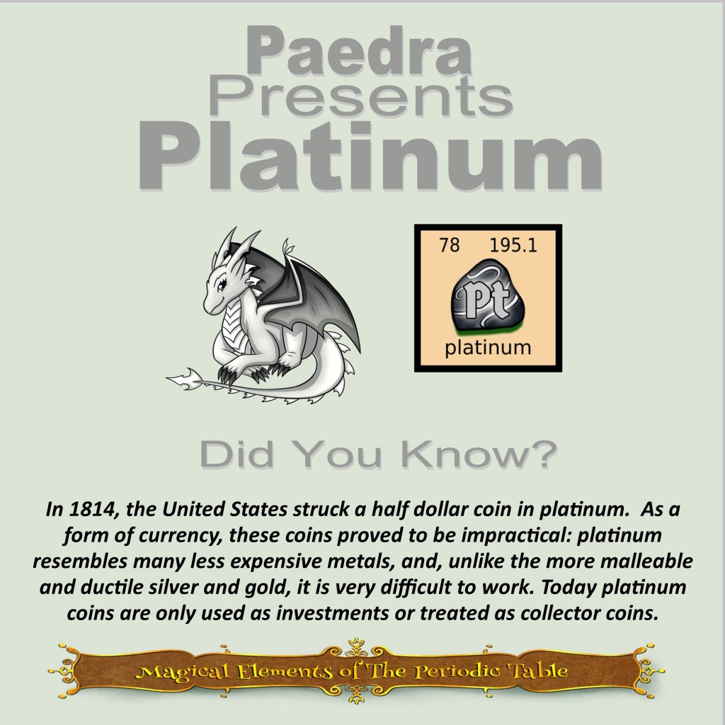 This article is brought to you by Sybrina Durant, the author of the middle grade picture book, Magical Elements of the Periodic Table Presented Alphabetically By The Elemental Dragons. Learn More. In that book Platinum is presented by the dragon, Paedra.