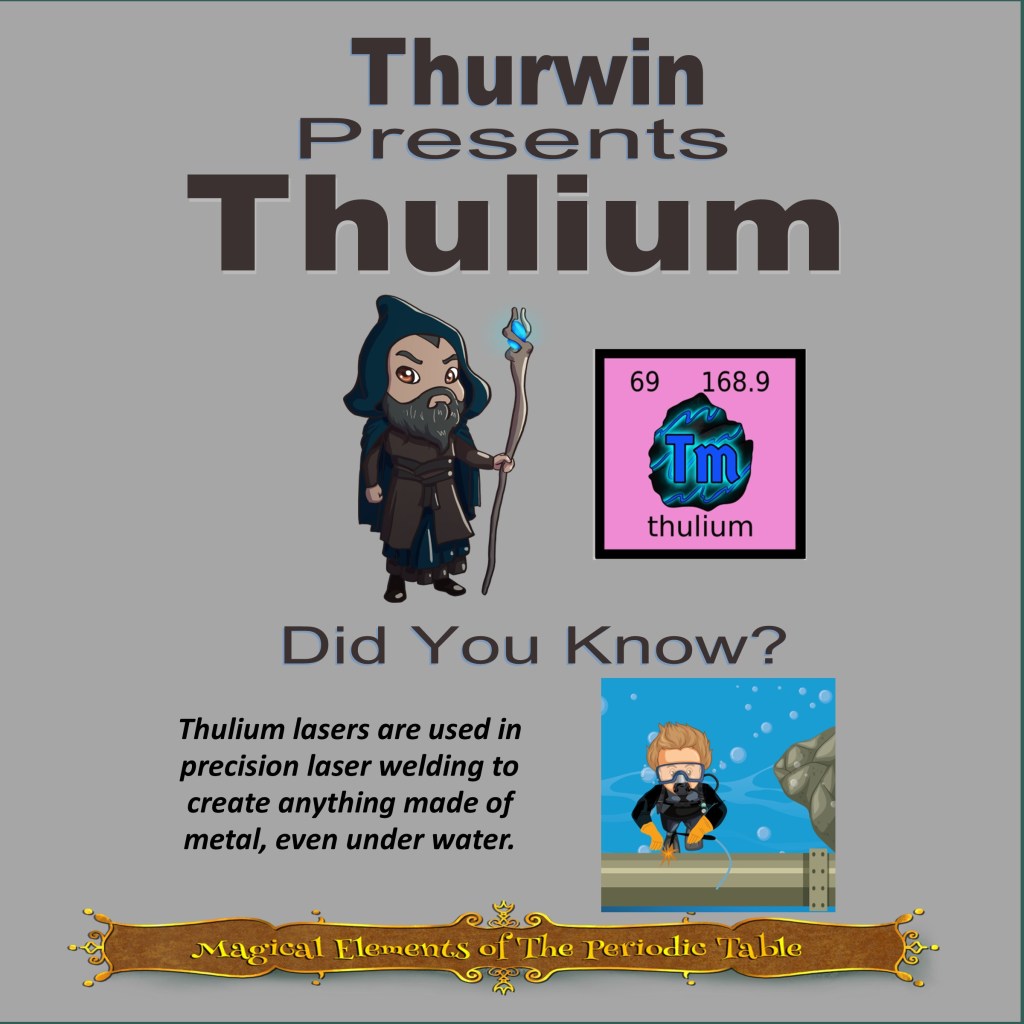 This article is brought to you by Sybrina Durant, the author of the middle grade picture book, Magical Elements of the Periodic Table Presented Alphabetically By The Elemental Wizards. Learn More. In that book Thulium is presented by the Wizard, Thurwin.