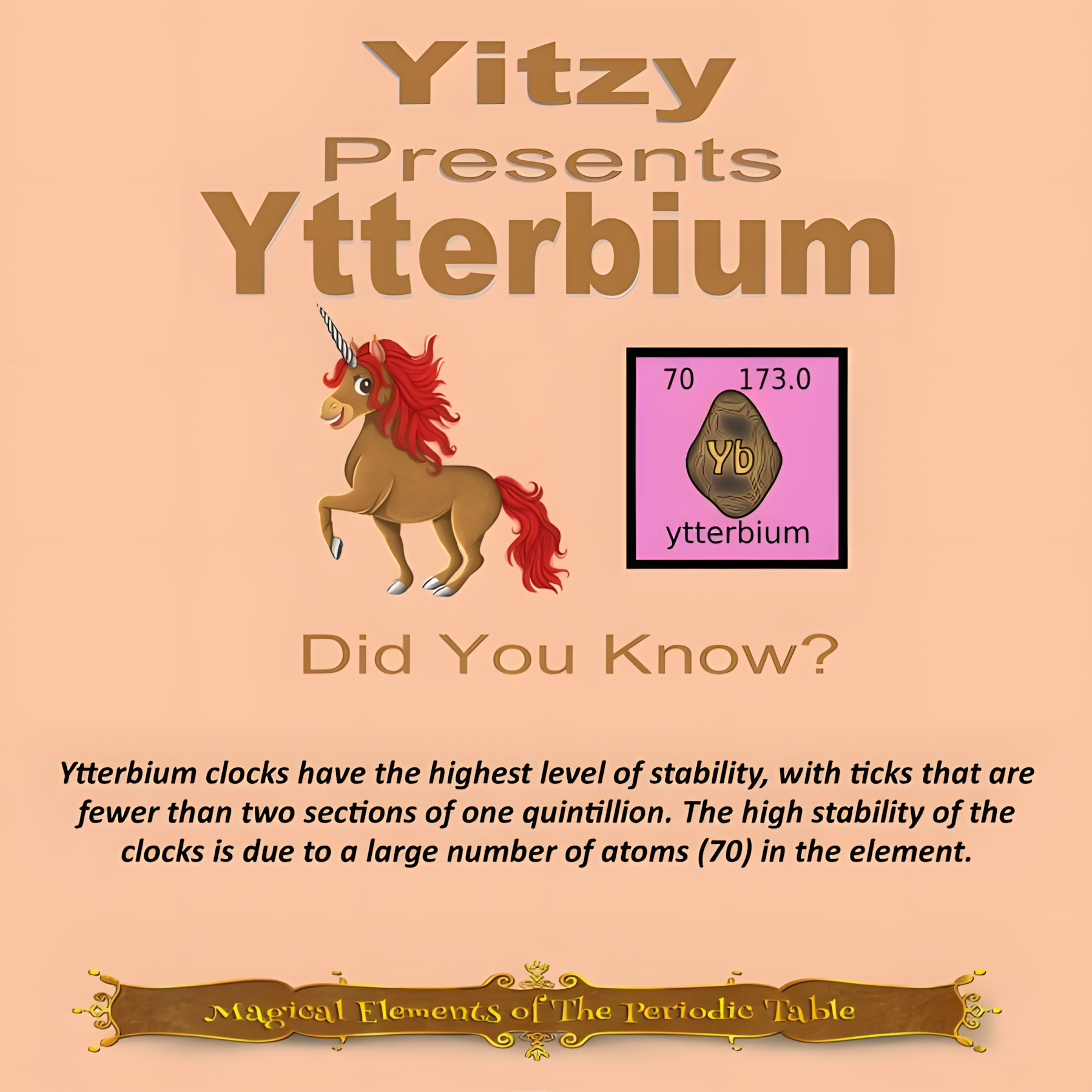 Yitzy Presents Ytterbium- Did You Know? Ytterbium clocks have the highest level of stability, with ticks that are fewer than two sections of one quintillion. The high stability of the clocks is due to a large number of atoms (70) in the element.