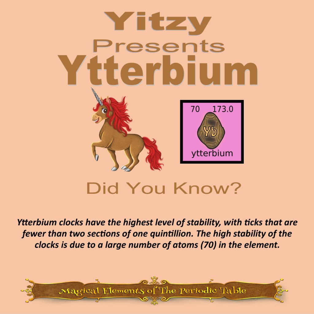 This article is brought to you by Sybrina Durant, the author of the middle grade picture book, Magical Elements of the Periodic Table Presented Alphabetically By The Metal Horn Unicorns. Learn More. In that book Ytterbium is presented by the unicorn, Yitzy.