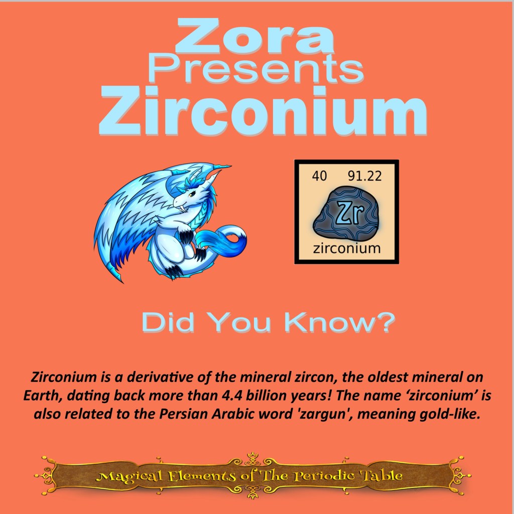 This article is brought to you by Sybrina Durant, the author of the middle grade picture book, Magical Elements of the Periodic Table Presented Alphabetically By The Elemental Dragons. Learn More. In that book Zirconium is presented by the dragon, Zora.