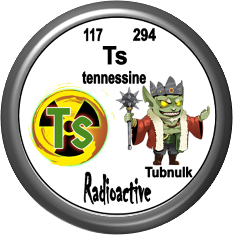 This is the front side of the game card for Tubnulk the Radioactive Goblin Fueled By Tennessine. Click the pic to take a look at all the fun info on the back. Use it as a memorization tool, a trading card or as science class prizes and rewards.