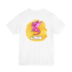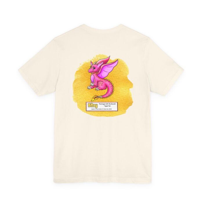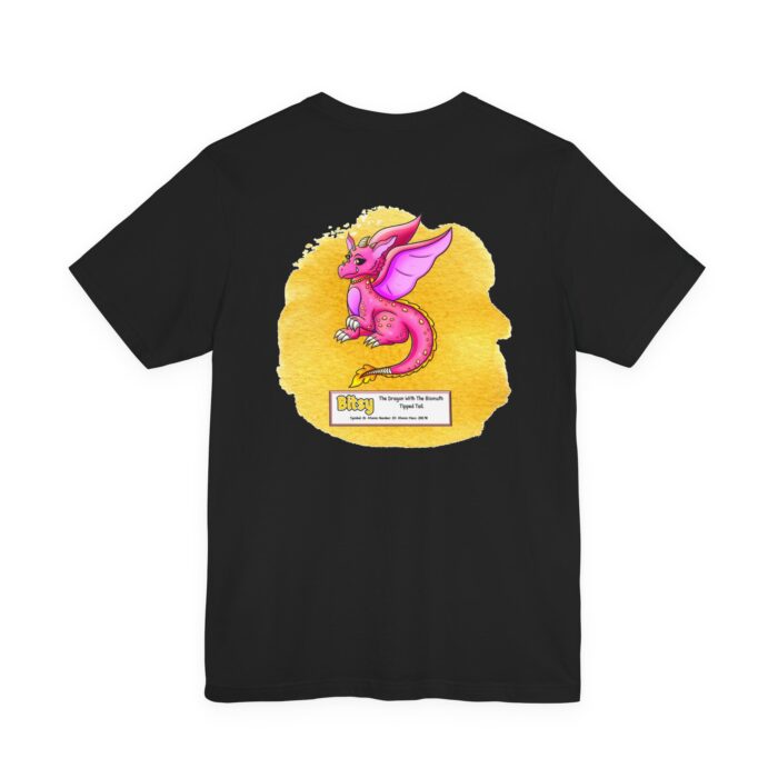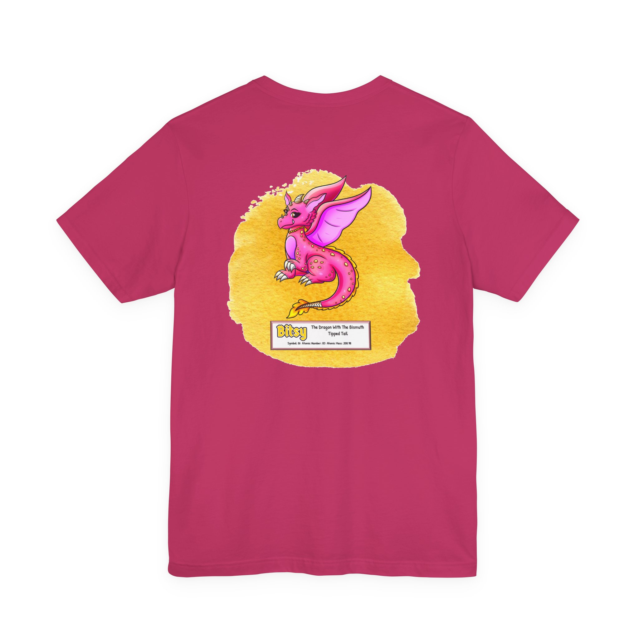 Bitsy Presents Bismuth Unisex Tee – Graphics from Magical Elements of the Periodic Table. Periodic Symbol on front, Bitsy the Dragon on the back.