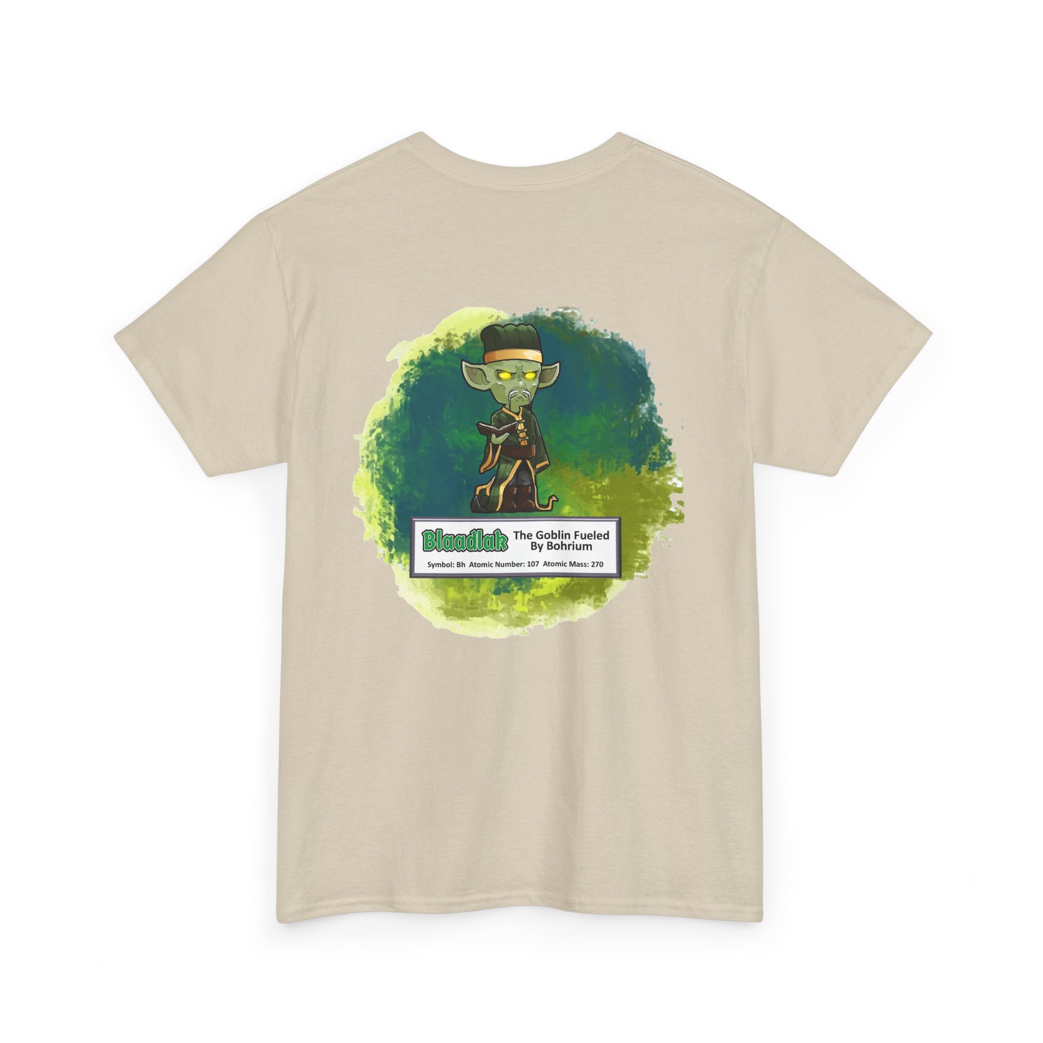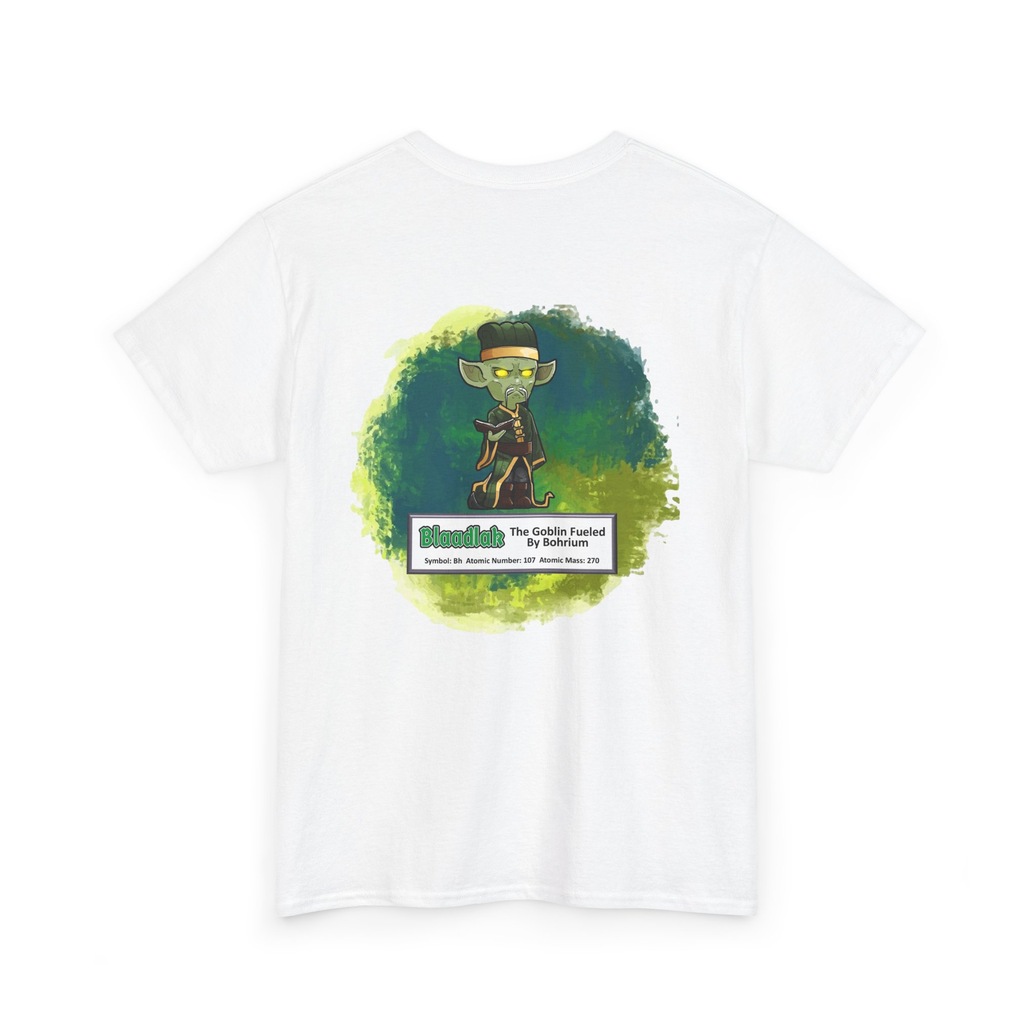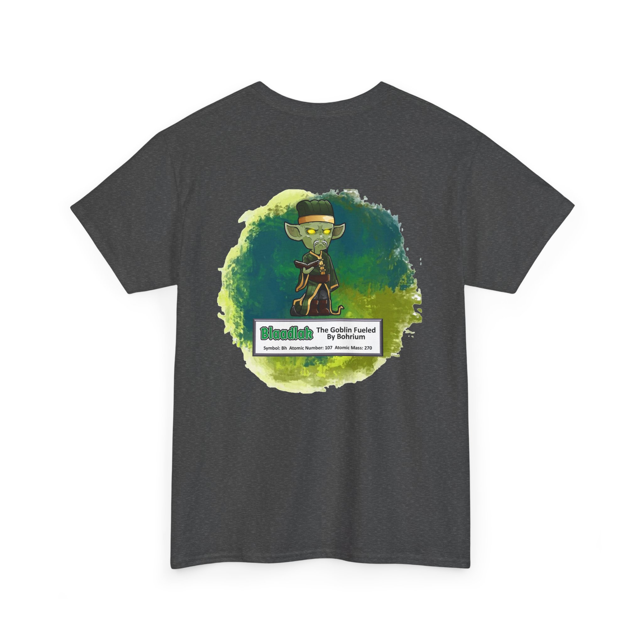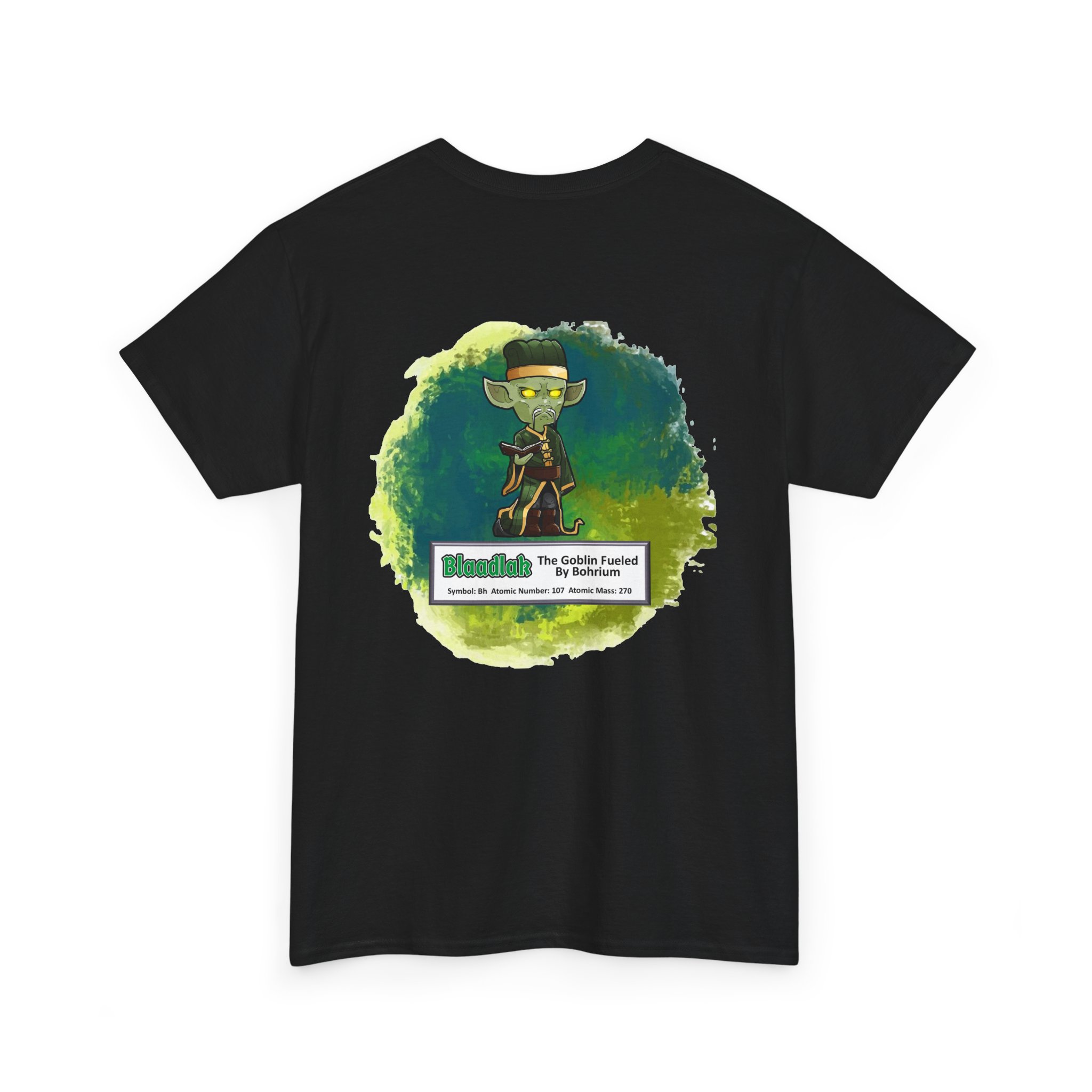 Blaadlak Presents Bohrium Unisex Tee – Graphic from Magical Elements of the Periodic Table – No Metal No Magic Logo on Front, Blaadlak the Goblin on the Back.