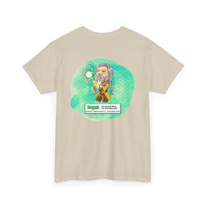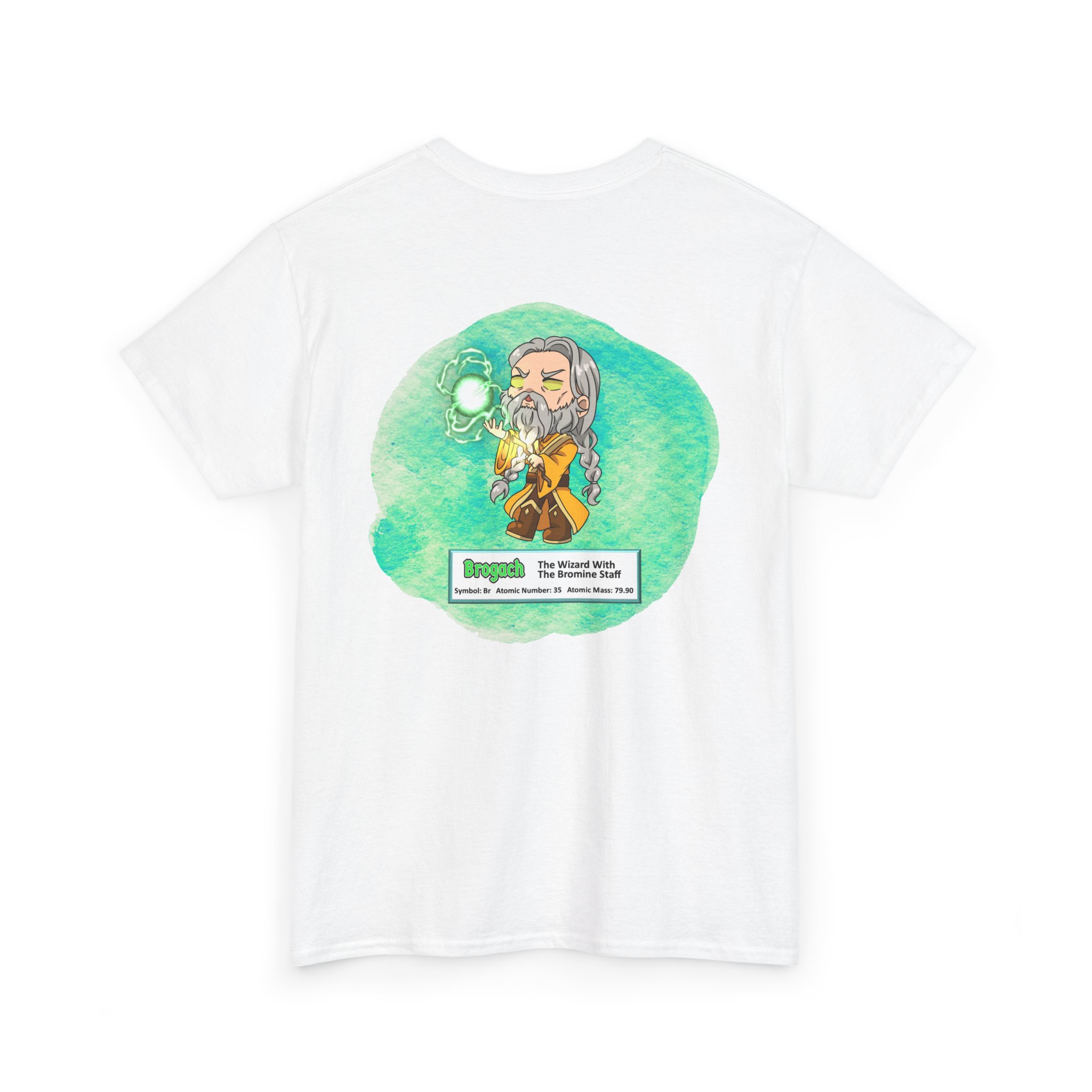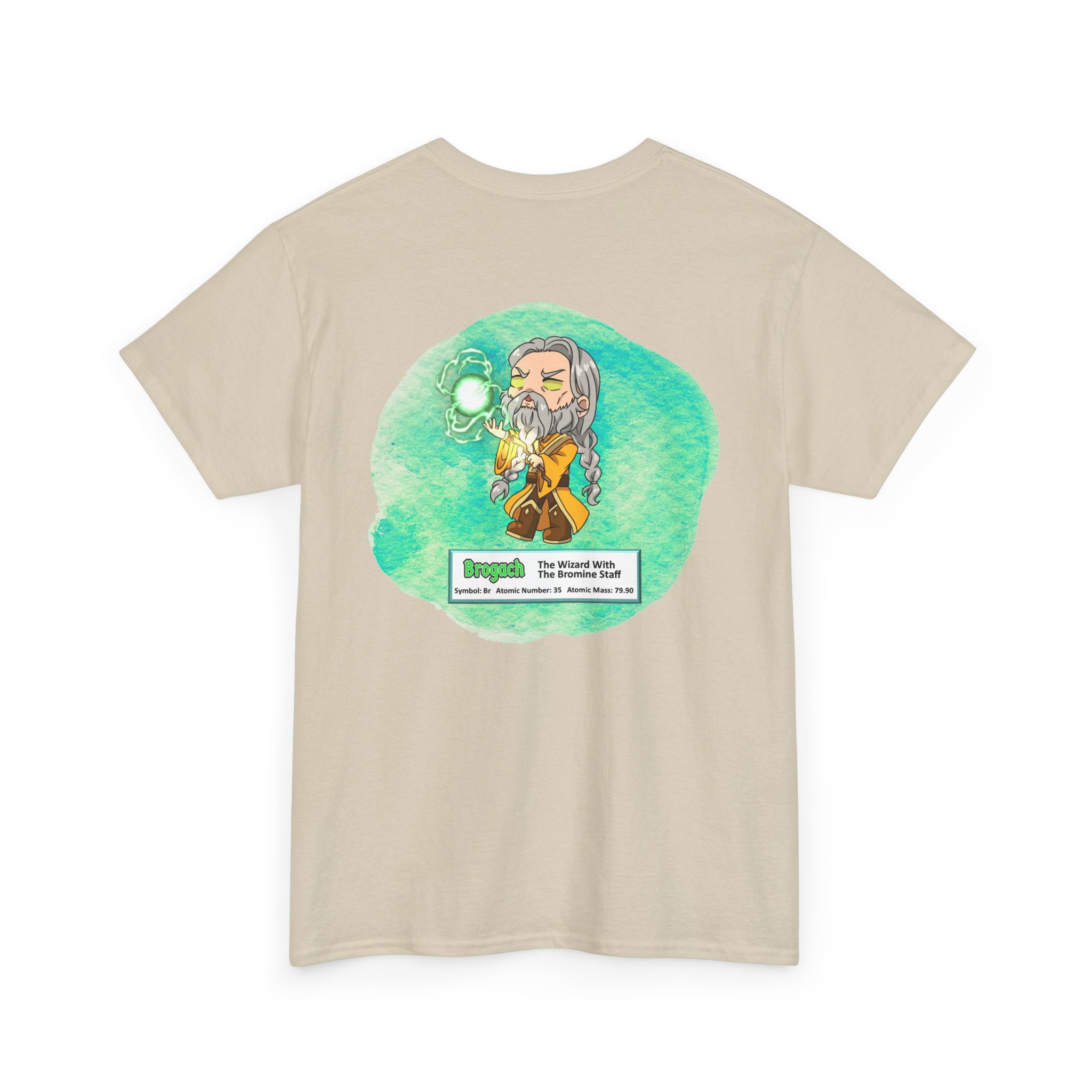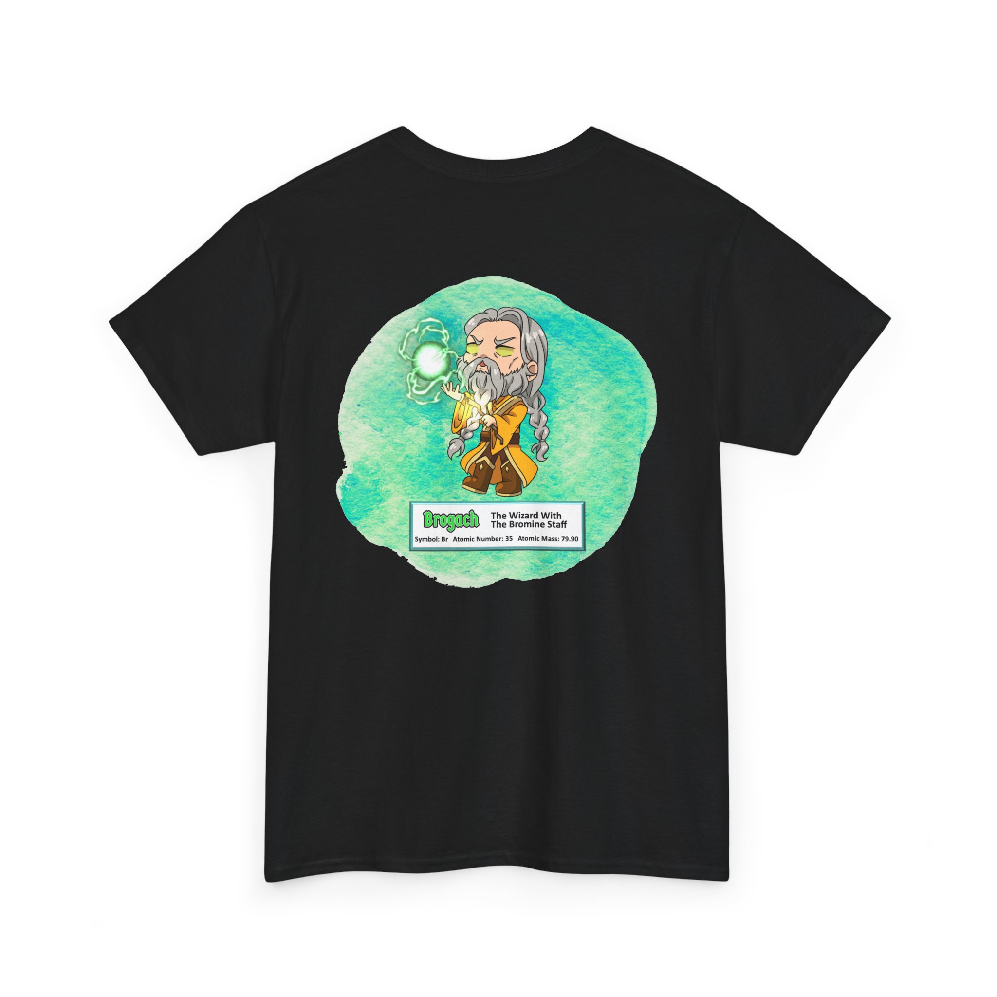 Brogach Presents Bromine Unisex Tee – Graphic from Magical Elements of the Periodic Table – No Metal No Magic Logo on Front, Brogach the Wizard on the Back.