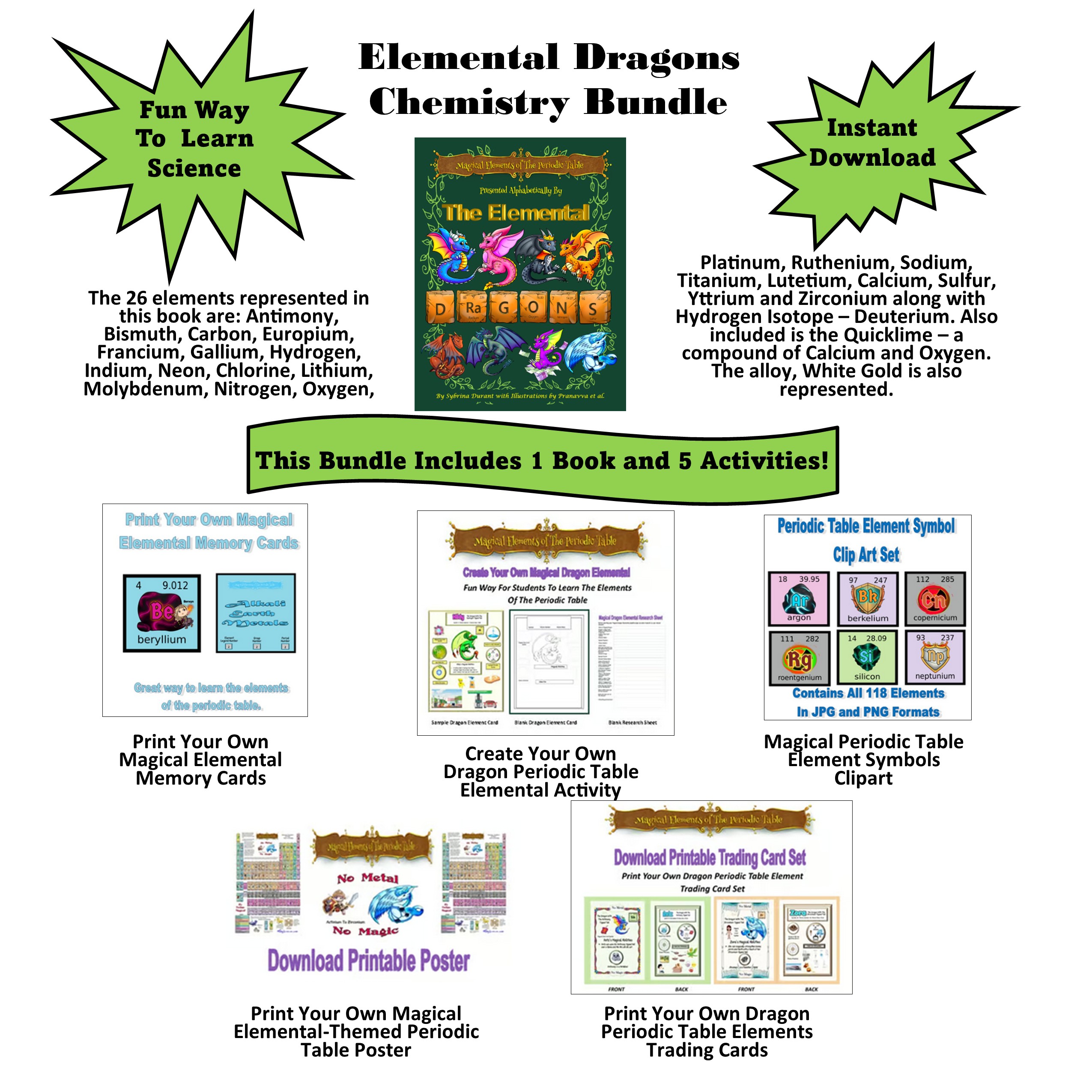Dive deeper into the mystical realm of alloys with the exquisite White Gold dragon, and enhance the learning experience through five engaging downloadable “print your own” games and activities. From designing your very own Dragon Periodic Table to sharing trading cards and playing memory games, this bundle seamlessly marries fun with education, making chemistry an enchanting adventure for young minds. Ignite the spark of curiosity and transform the study of chemistry into a magical journey for your budding young explorers today!