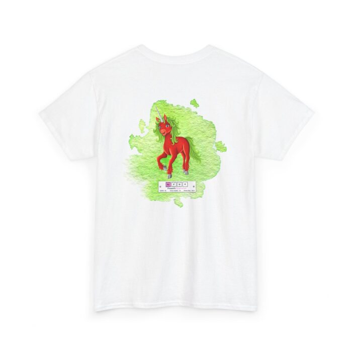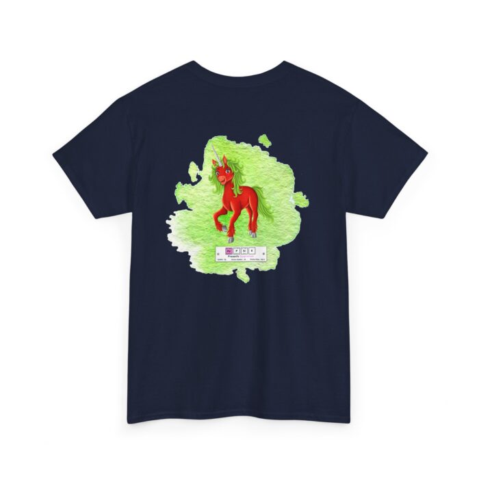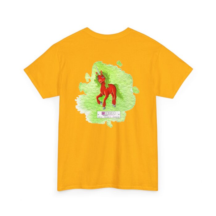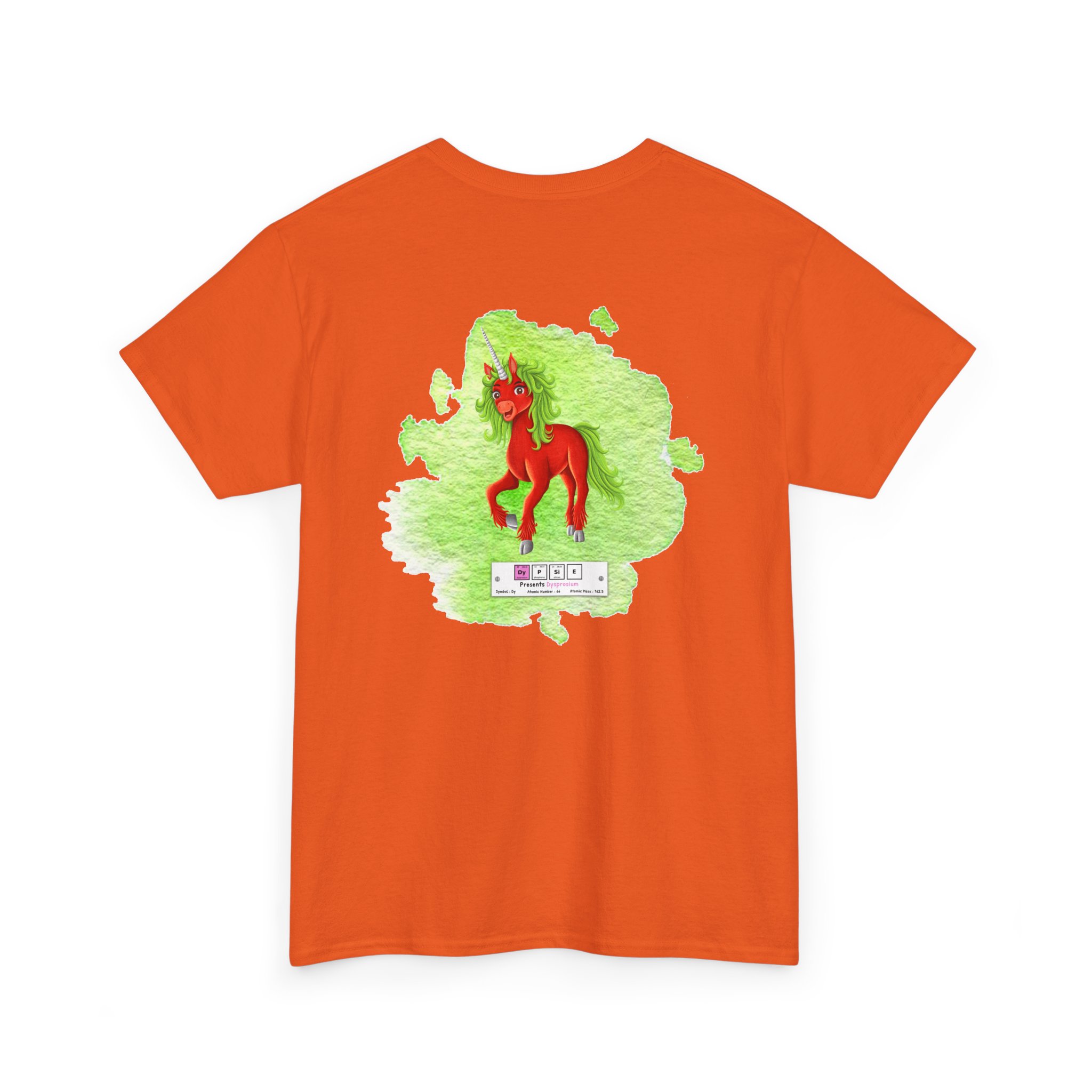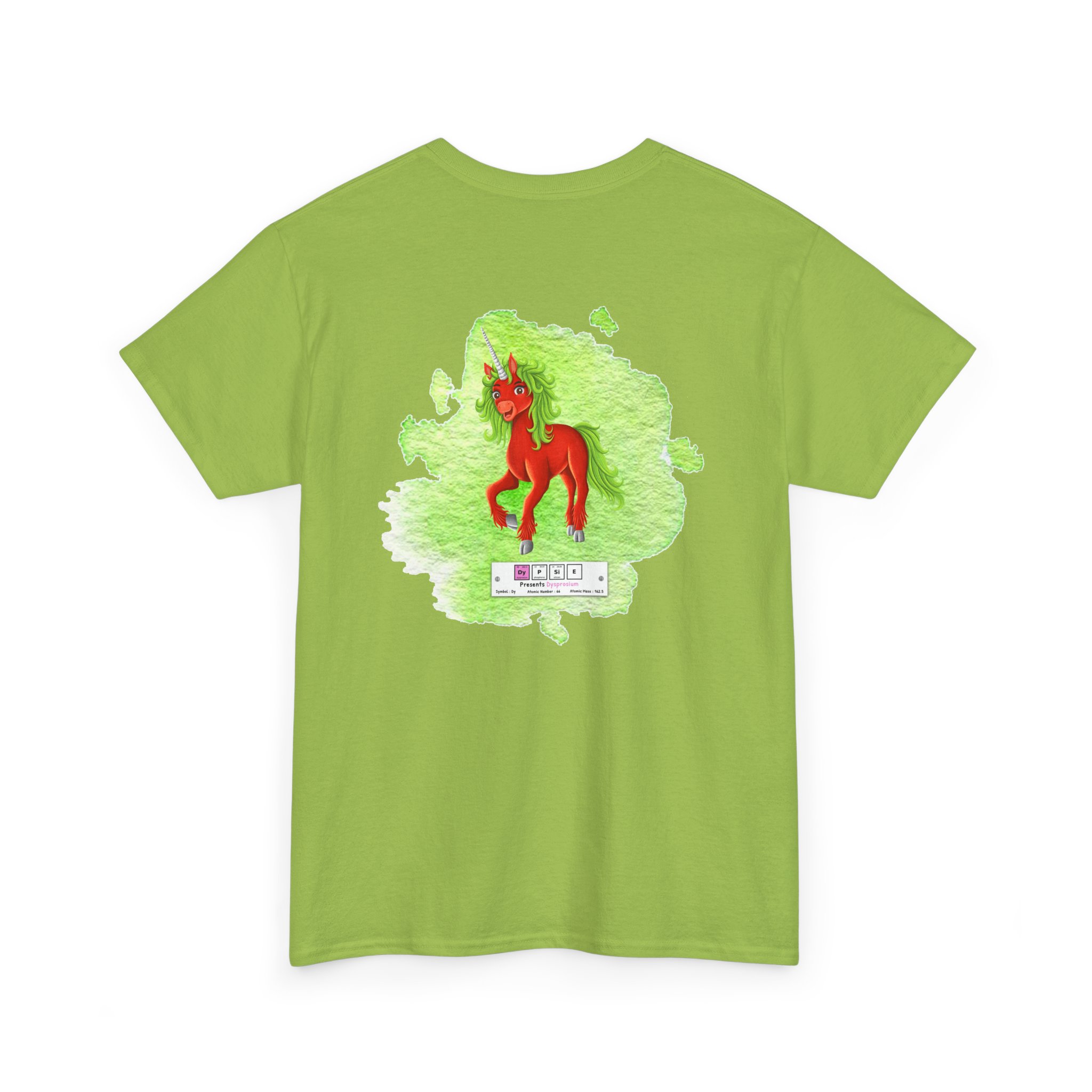 Dypsie Presents Dysprosium Unisex Tee – Graphic from Magical Elements of the Periodic Table – No Metal No Magic Logo on Front, Dypsie the Unicorn on the Back.