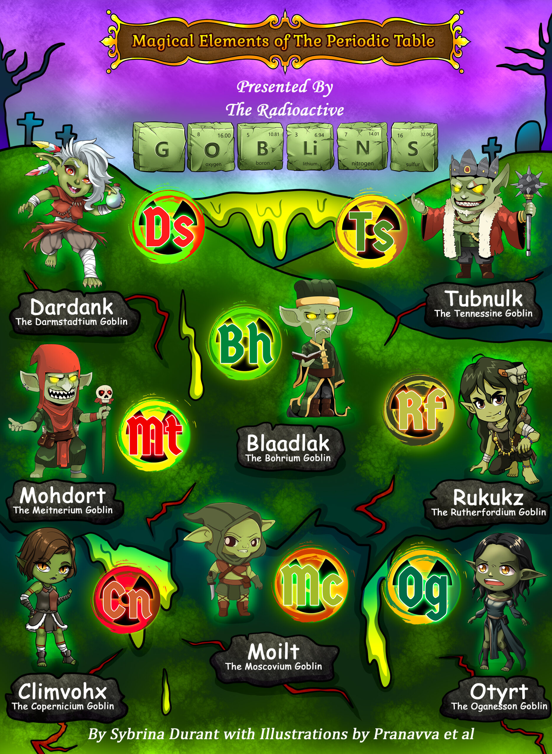Meet Blaadlak, who introduces readers to the mysterious Bohrium, and join Tubnulk, the majestic Goblin King, as he channels the incredible powers of Tennessine to control elements in his dominion. Encounter Dardank, the ingenious potion-brewer deriving energy from Darmstadtium, and Sterx, whose rare Seaborgium grants her the explosive ability to manipulate and transmute matter. These are just a few in the extraordinary lineup of characters that makes learning about the periodic table captivating and accessible!