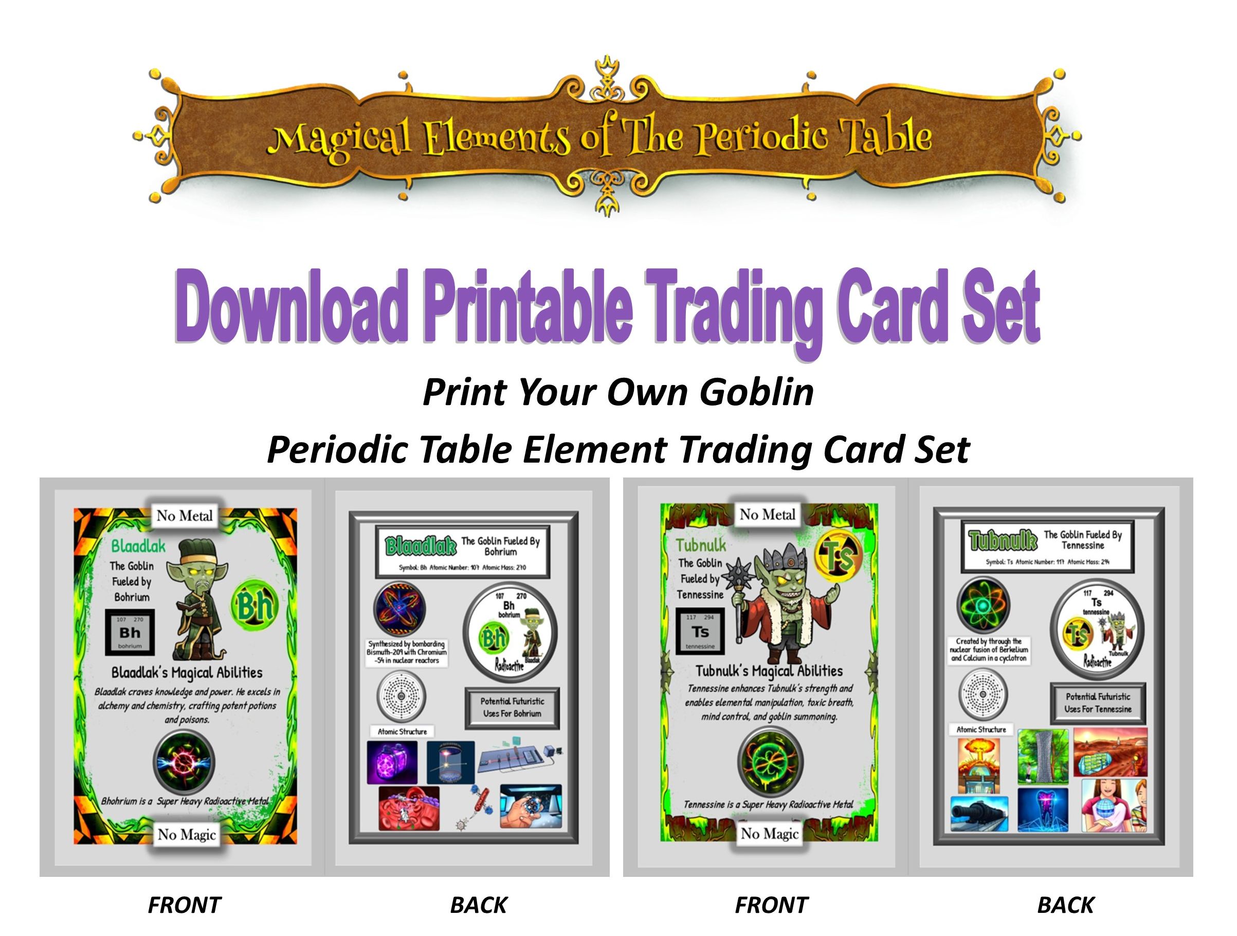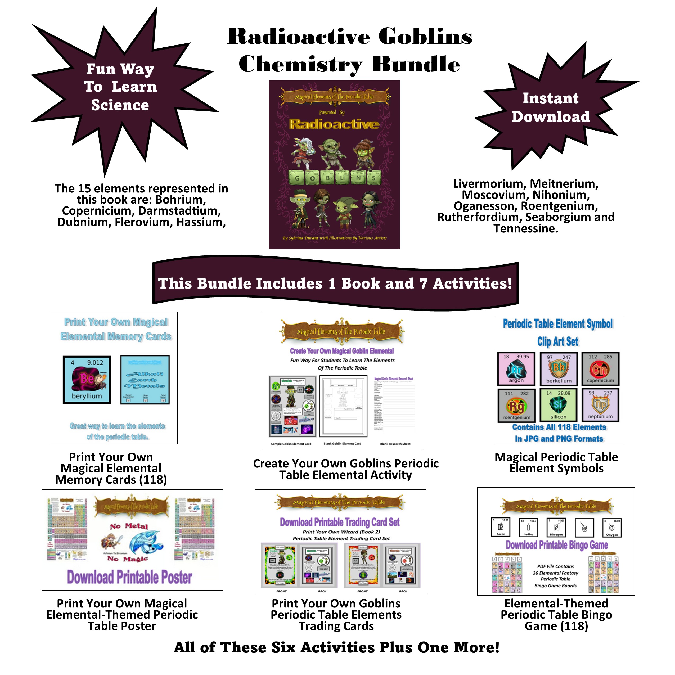 This Print Your Own bundle contains the book titled Magical Elements of the Periodic Table Presented by the Radioactive Goblins plus the Create Your Own Goblins Periodic Table Elements Activity Set plus the Elemental Periodic Table Goblins Trading Cards. Also included are Memory Cards, Symbol Clip Art, Print Your Own Elemental Periodic Table Poster, and a Periodic Table Element Sorter Puzzle to help kids have more fun learning about the periodic table.
