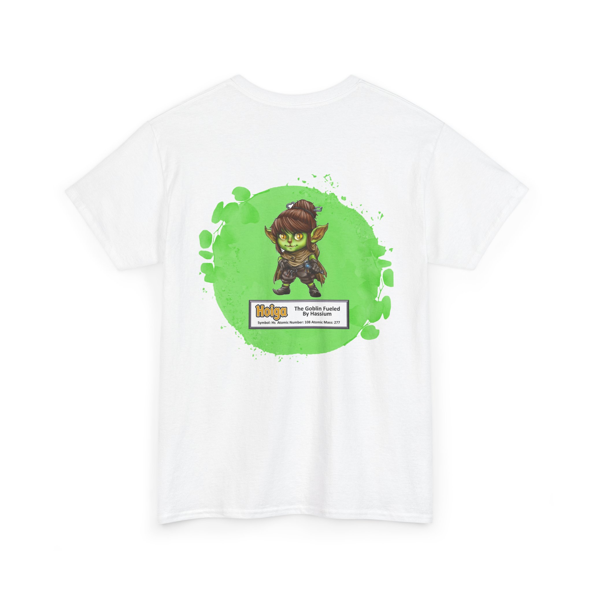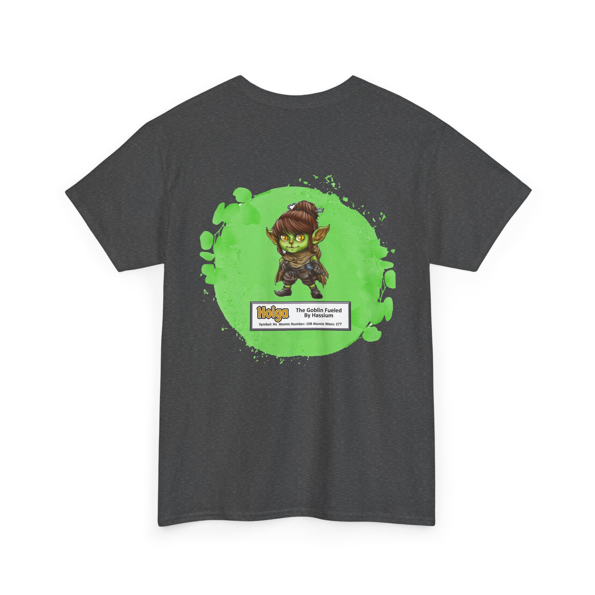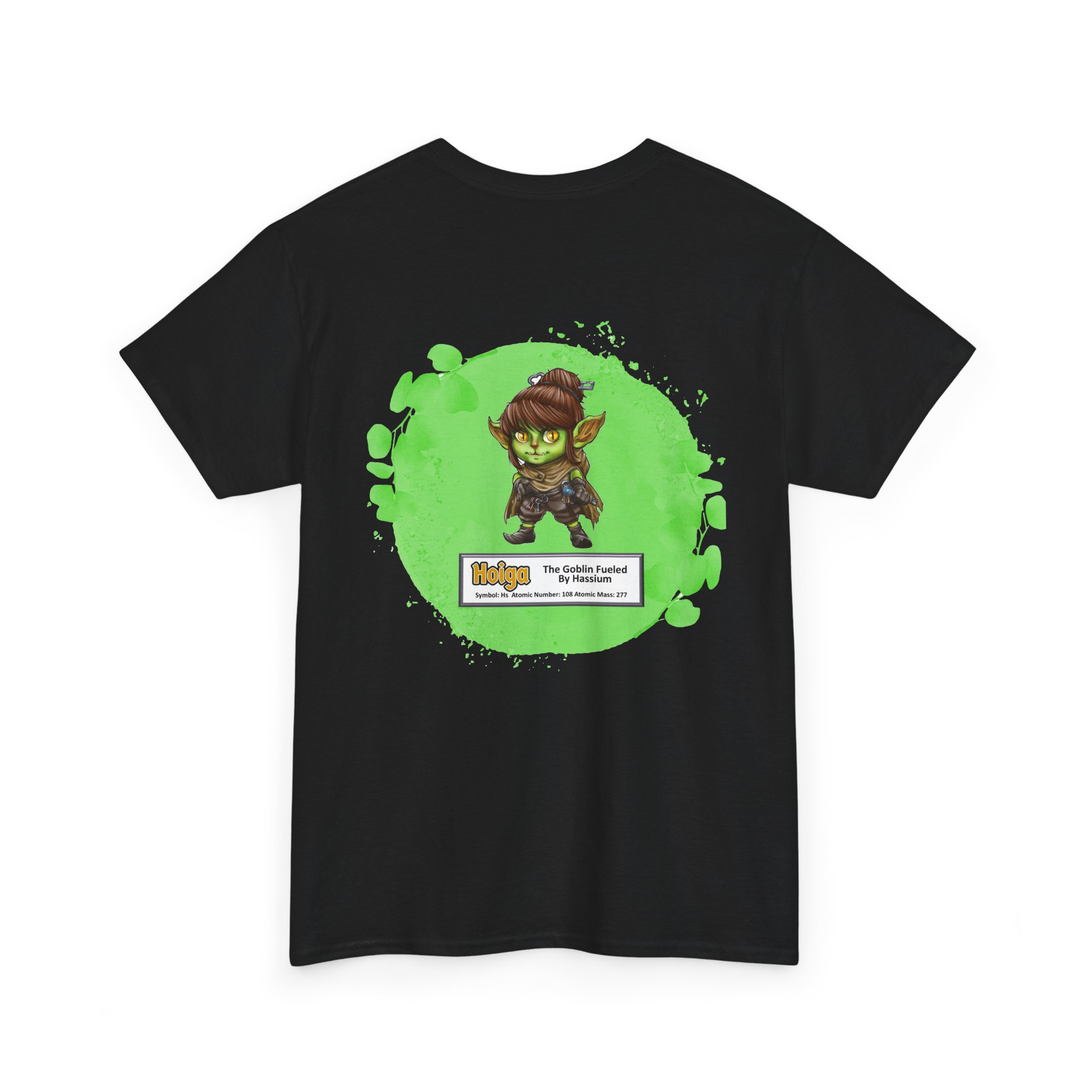 Hoiga Presents Hassium Unisex Tee  –  Graphic from Magical Elements of the Periodic Table – No Metal No Magic Logo on Front, Hoiga the Goblin on the Back.