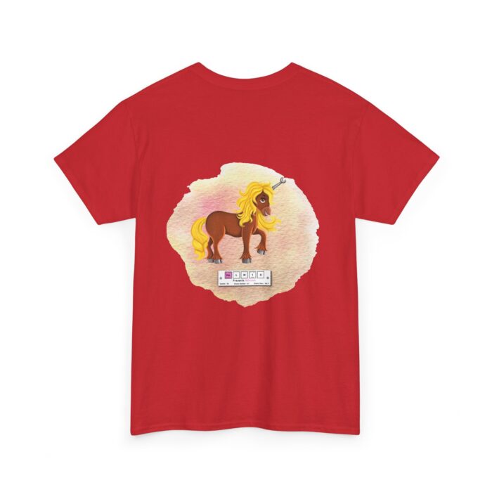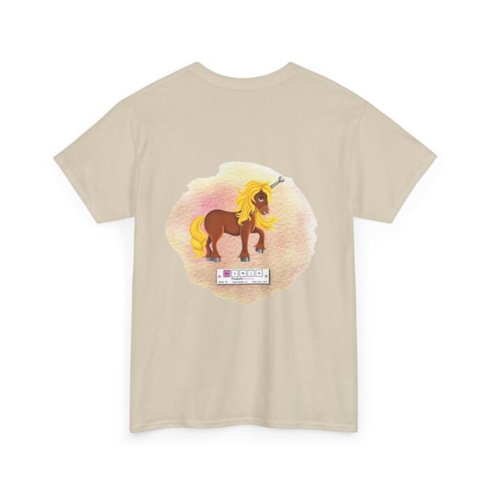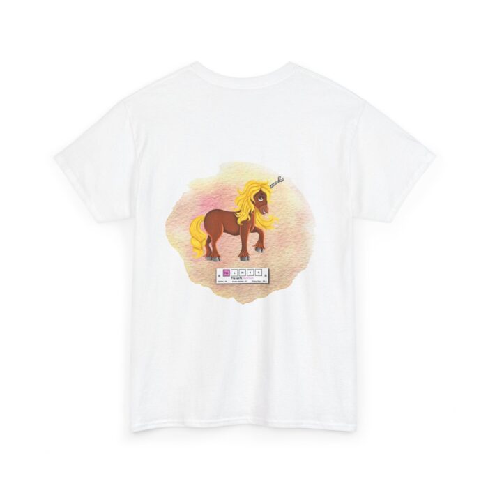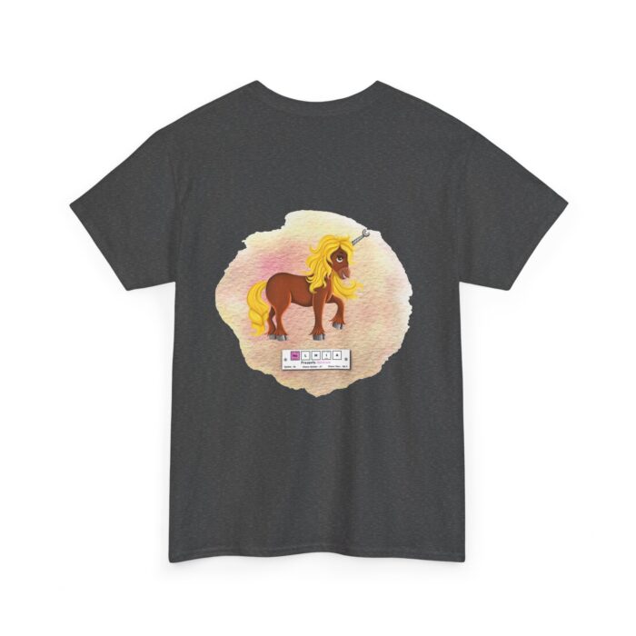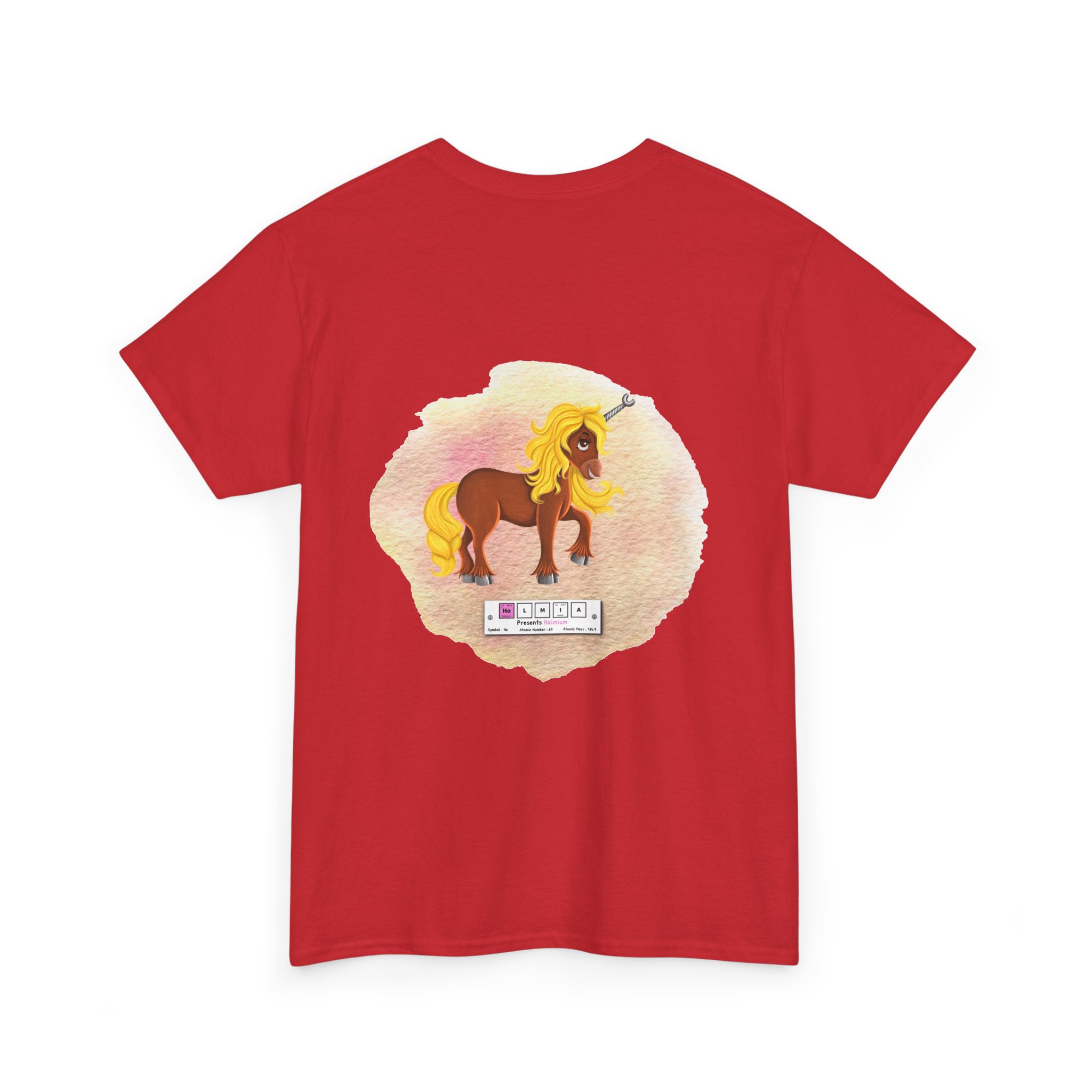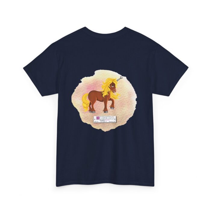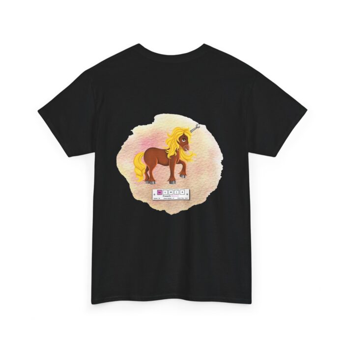 Holmia Presents HolmiumUnisex Tee – Graphic from Magical Elements of the Periodic Table – No Metal No Magic Logo on Front, Holmia the Unicorn on the Back.
