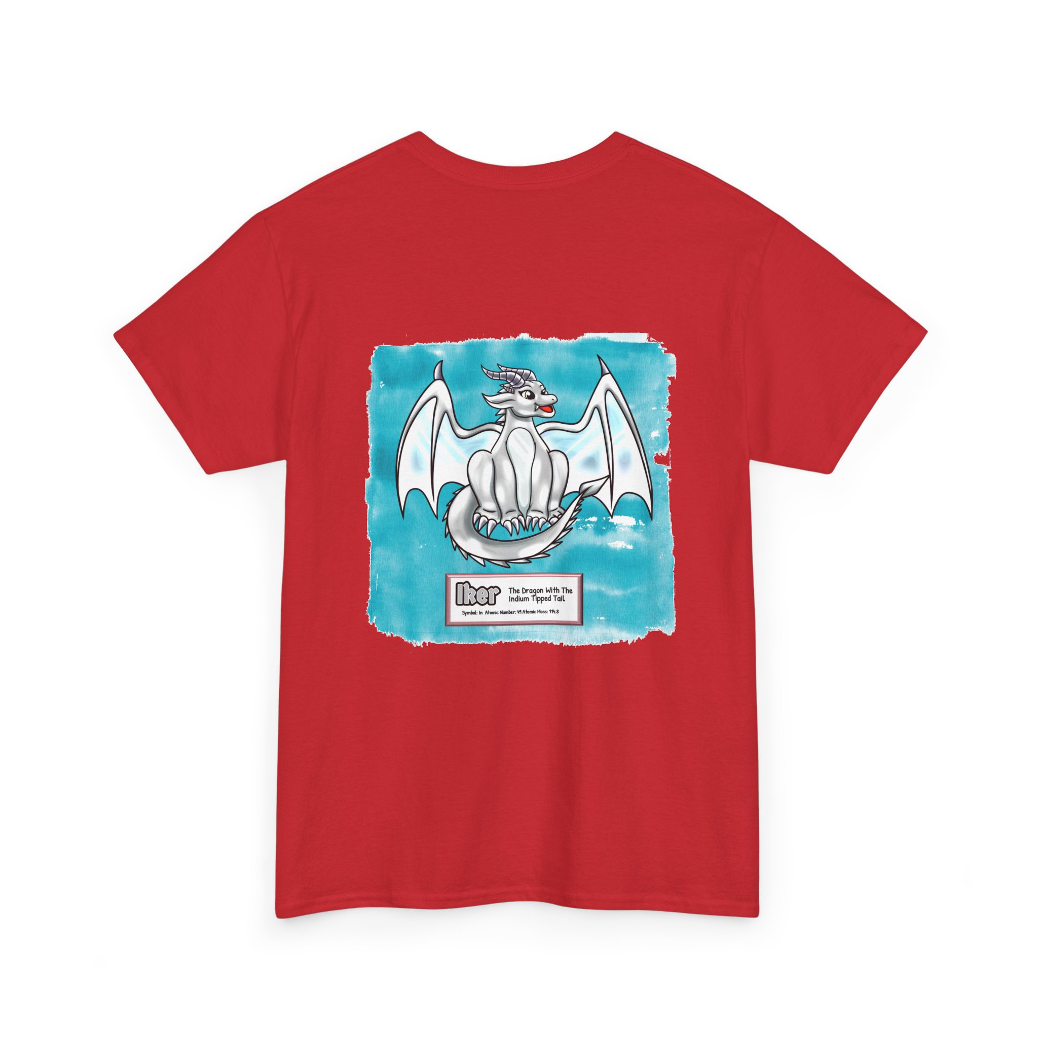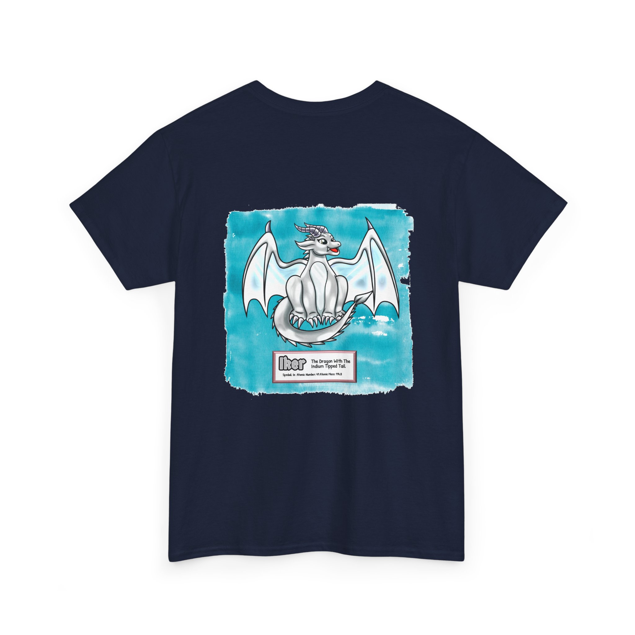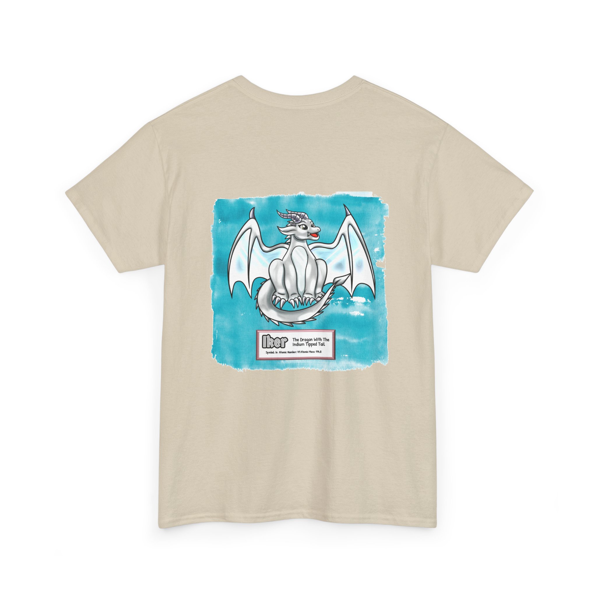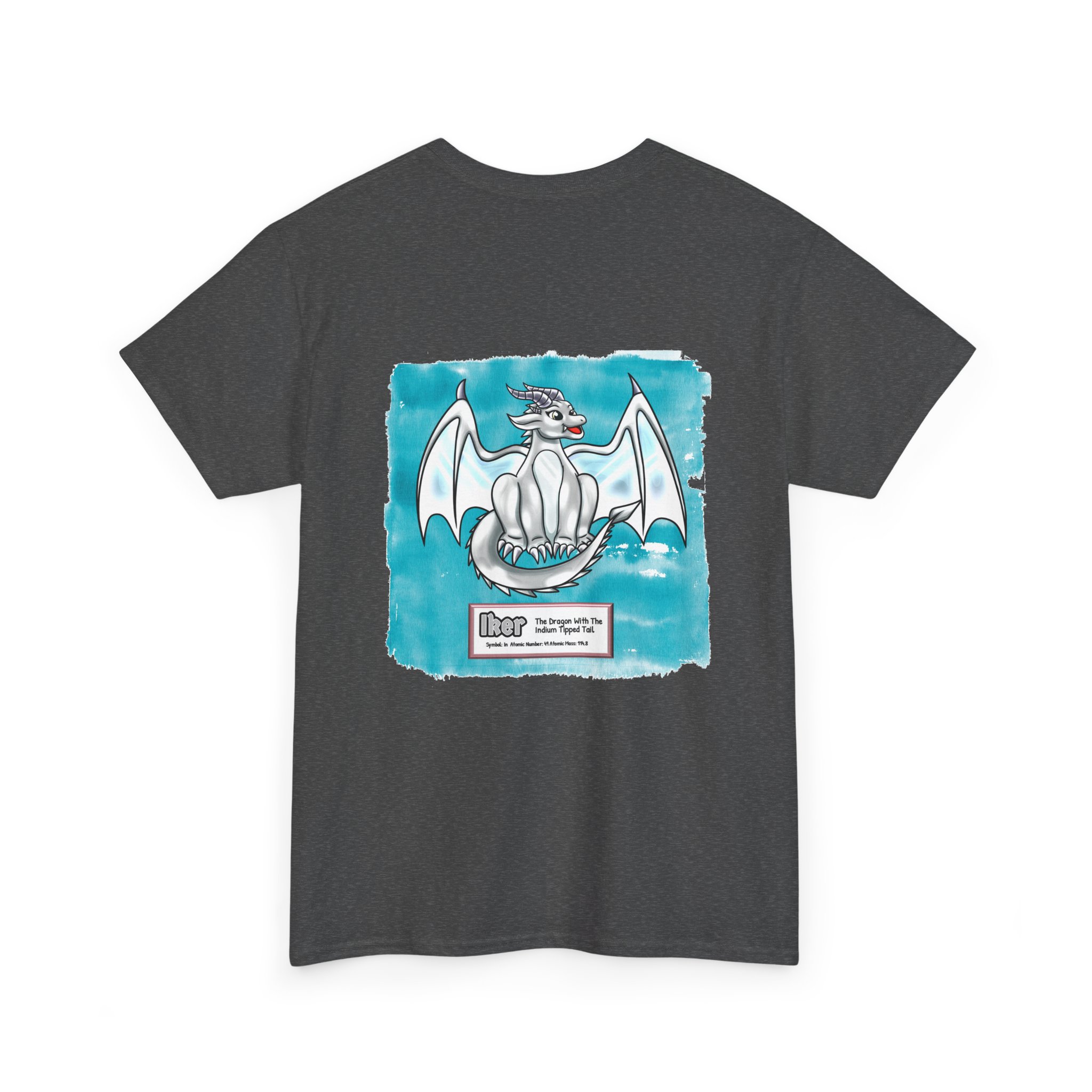 Iker Presents Indium Unisex Tee – Graphic from Magical Elements of the Periodic Table – No Metal No Magic Logo on Front, Iker the Dragon on the Back.