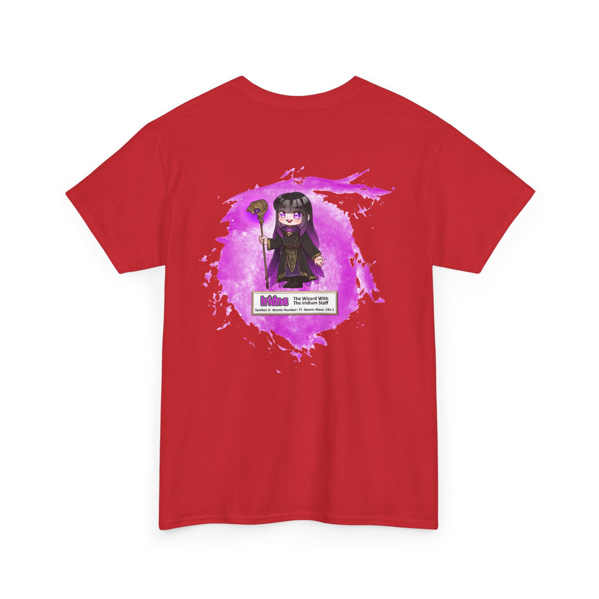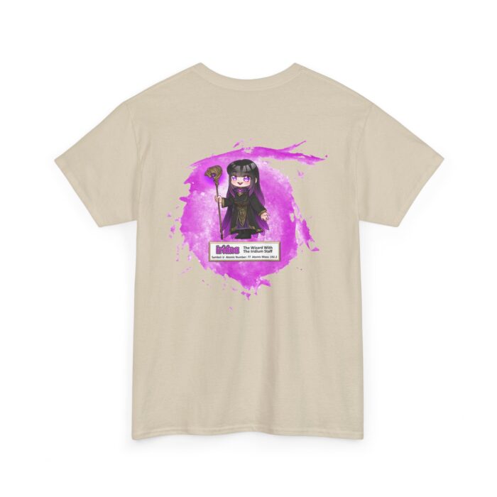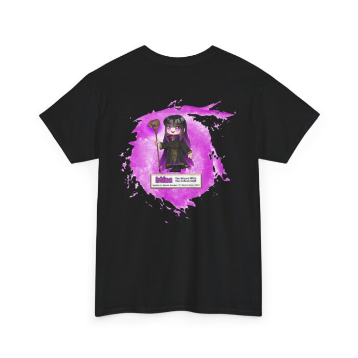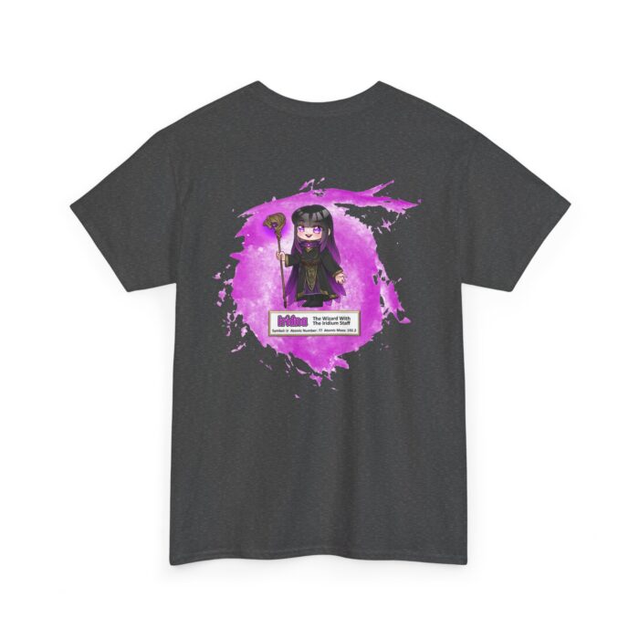 Iridna Presents Iridium Unisex Tee –  Graphic from Magical Elements of the Periodic Table – No Metal No Magic Logo on Front, Iridna the Wizard on the Back.