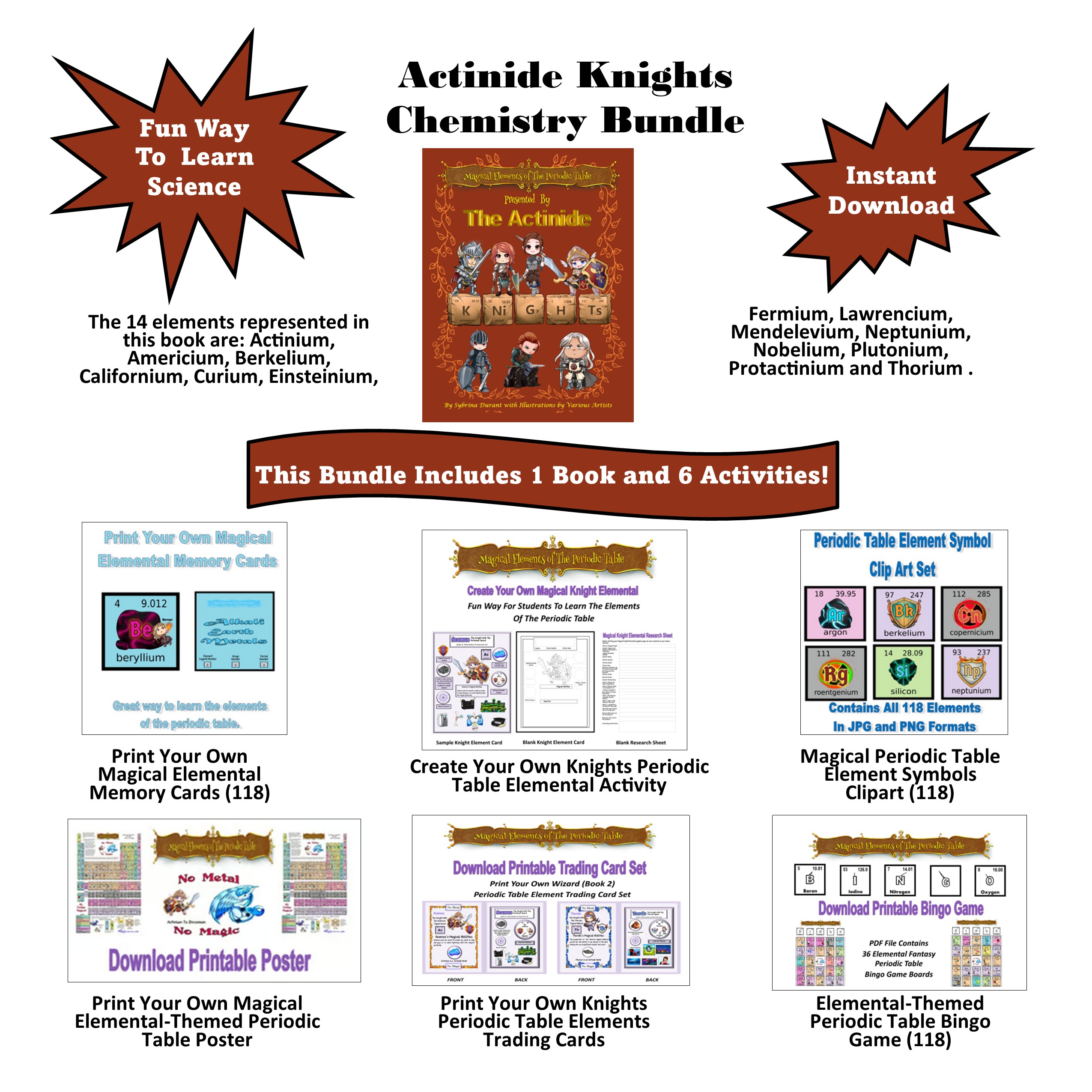 This Print Your Own bundle contains the book titled Magical Elements of the Periodic Table Presented By The Actinide Knights plus the Create Your Own Knights Periodic Table Elementsl Activity Set plus the Elemental Periodic Table Knights Trading Cards and a few other surprises like Memory Cards, Symbol Clip Art and A Free Print Your Own Elemental Periodic Table Poster to help kids have more fun learning about the periodic table.
