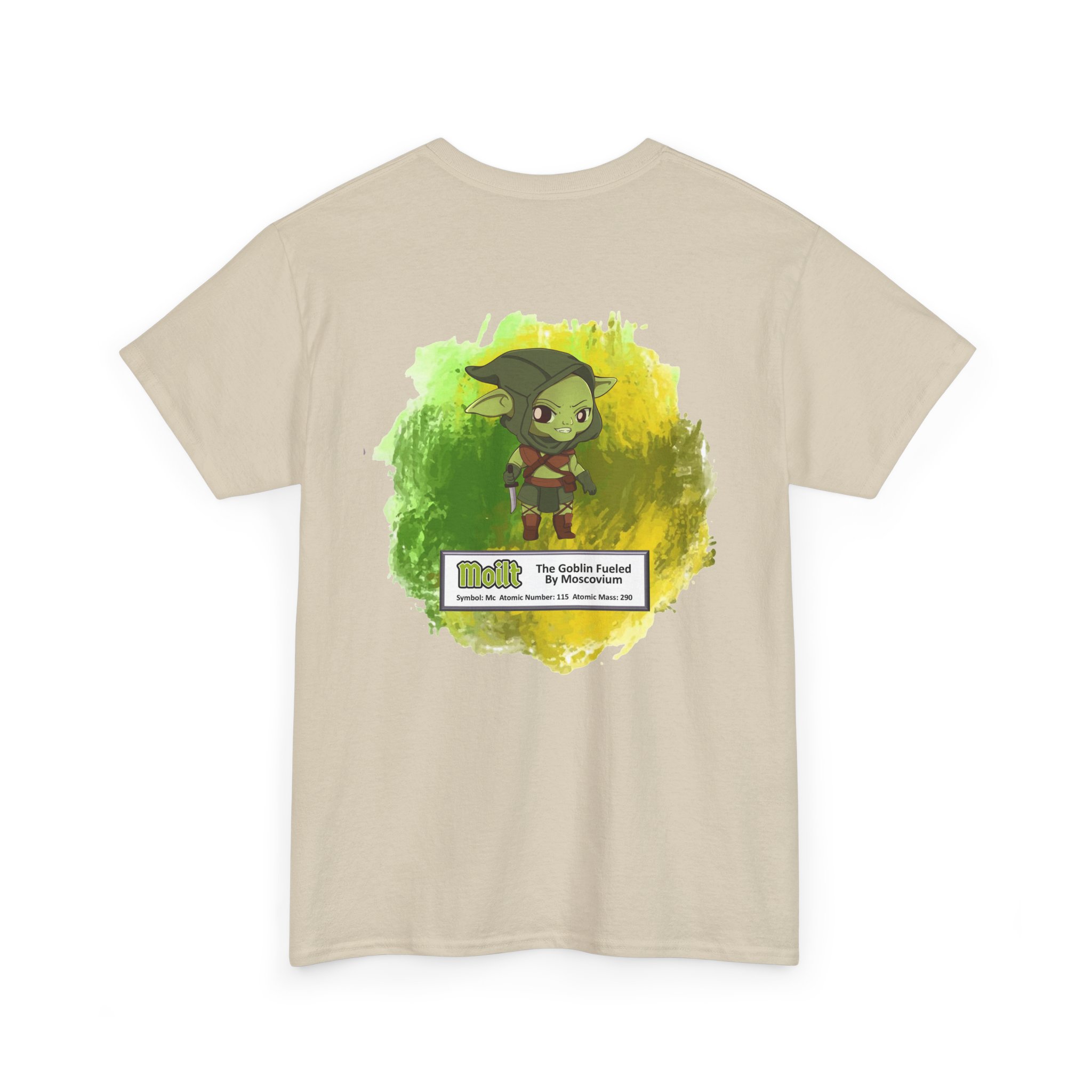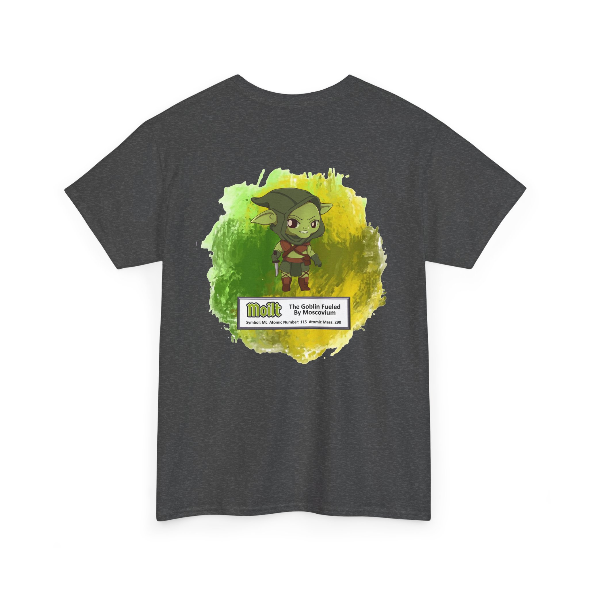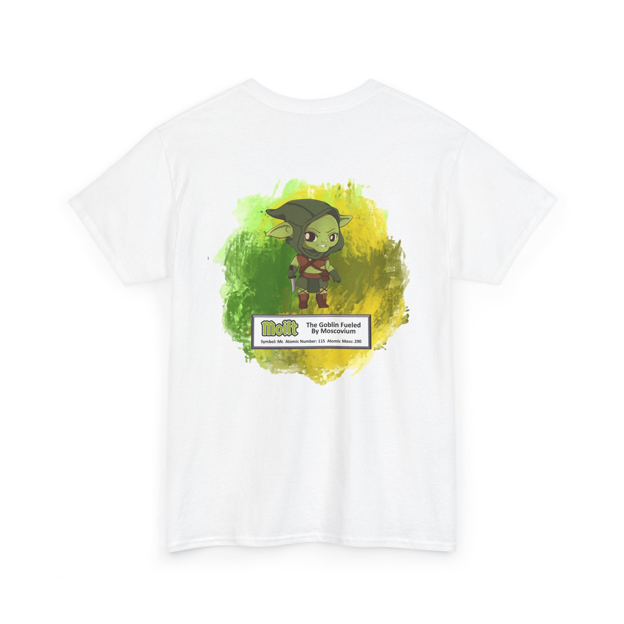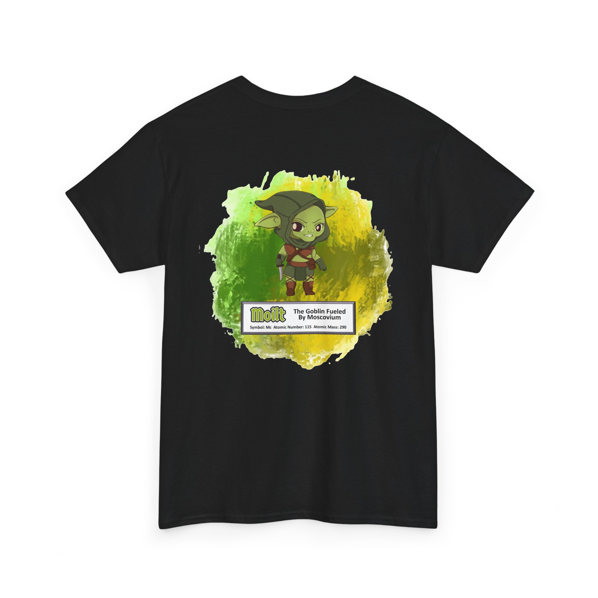 Moilt Presents Moscovium Unisex Tee – Graphic from Magical Elements of the Periodic Table – No Metal No Magic Logo on Front, Moilt the Goblin on the Back.