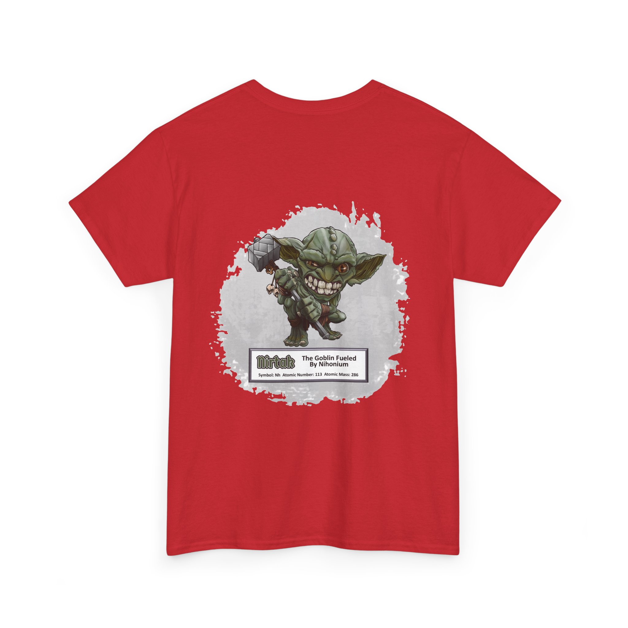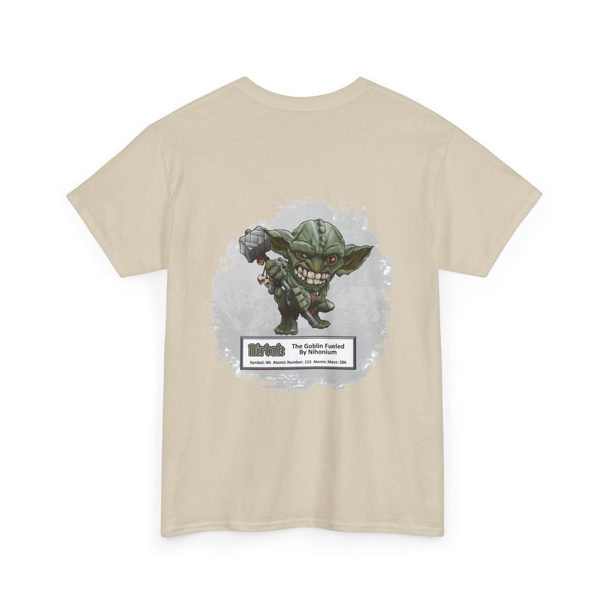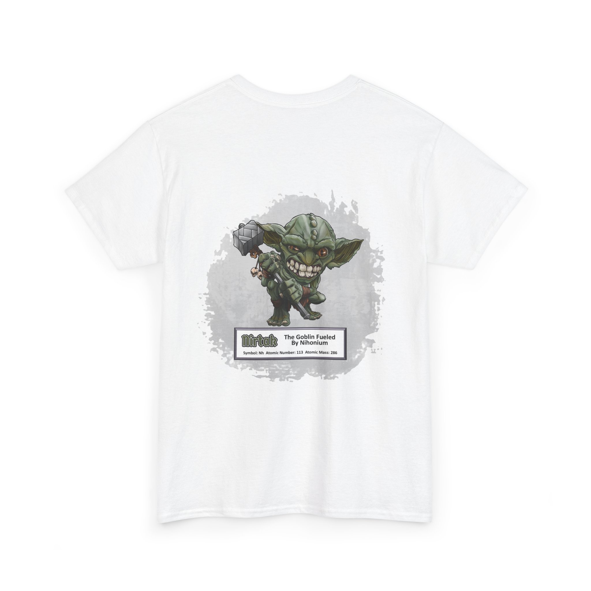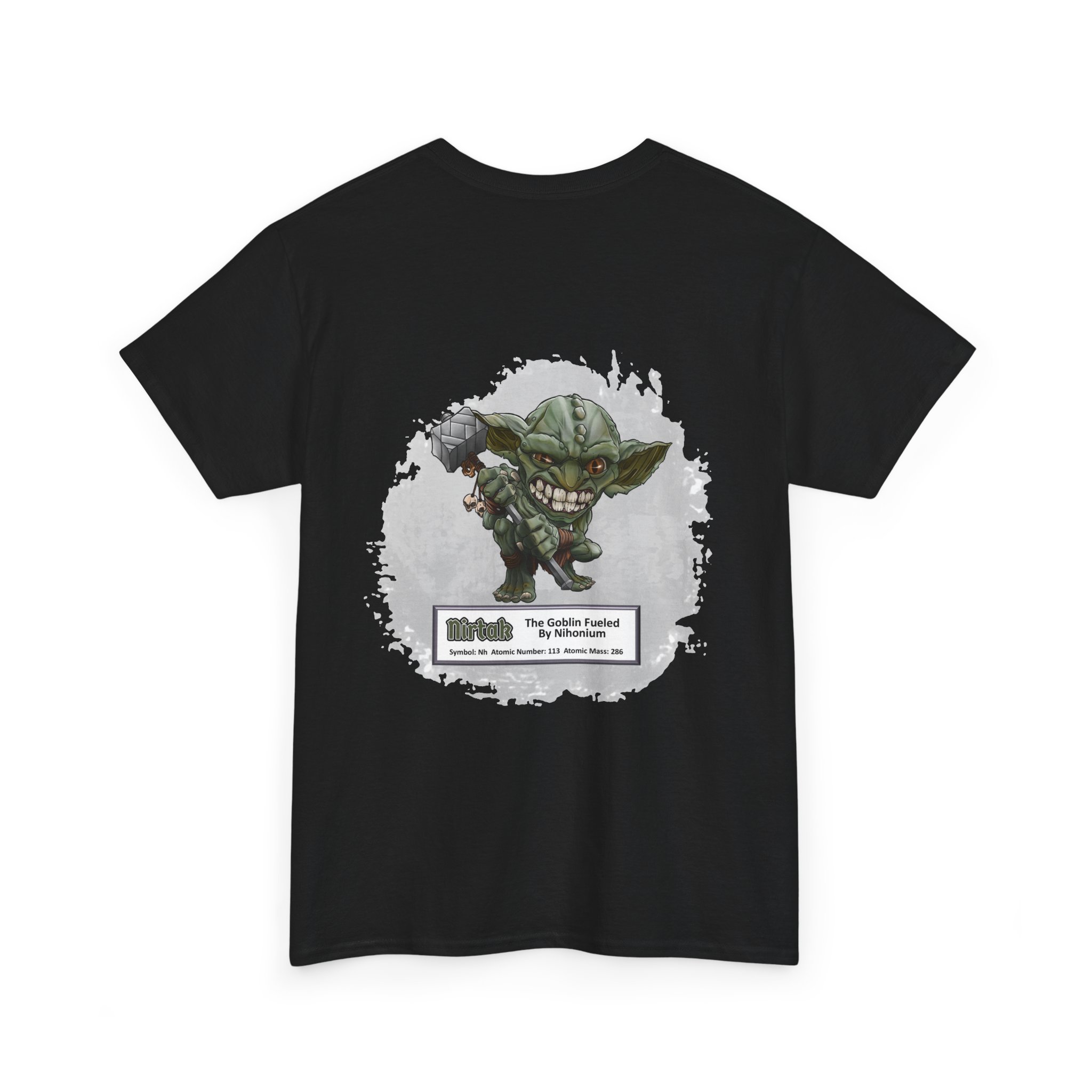 Nirtak Presents Nihonium Unisex Tee  –  Graphic from Magical Elements of the Periodic Table – No Metal No Magic Logo on Front, Nirtak the Goblin on the Back.