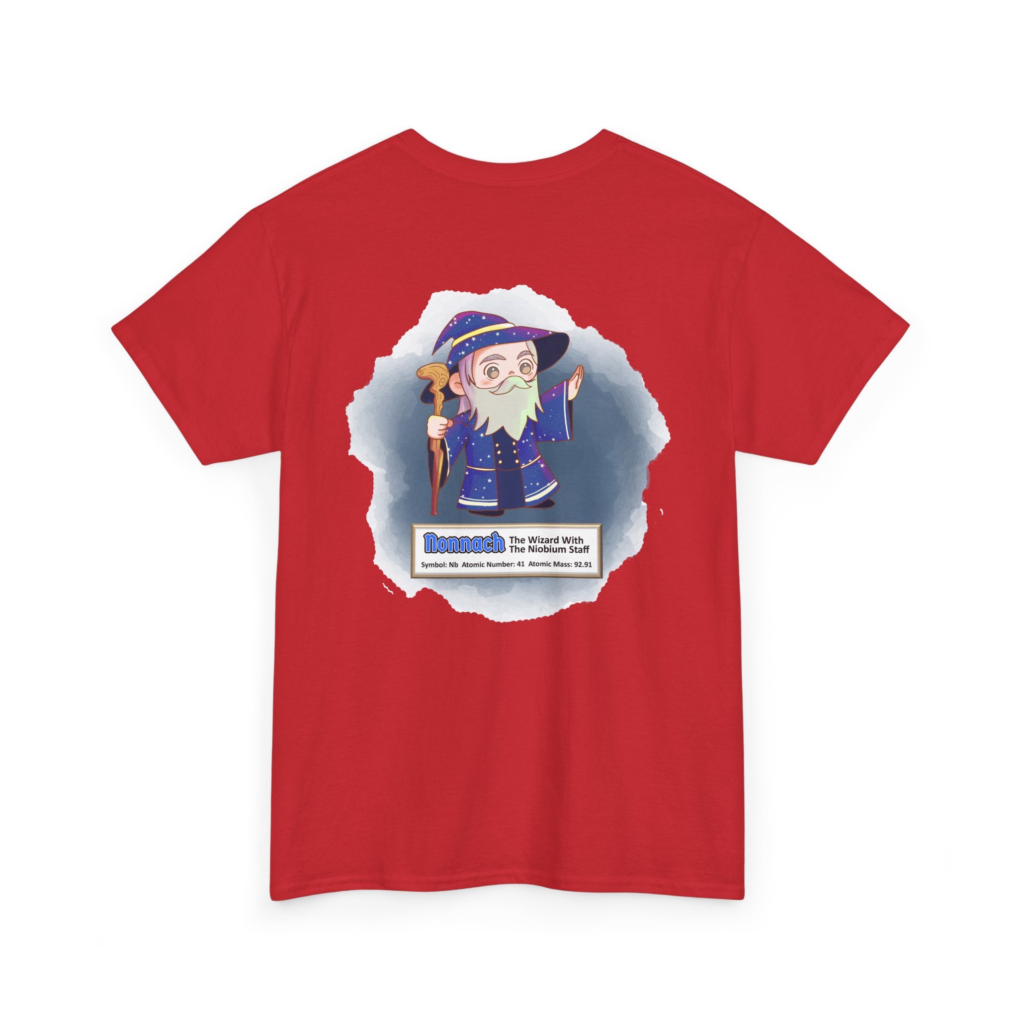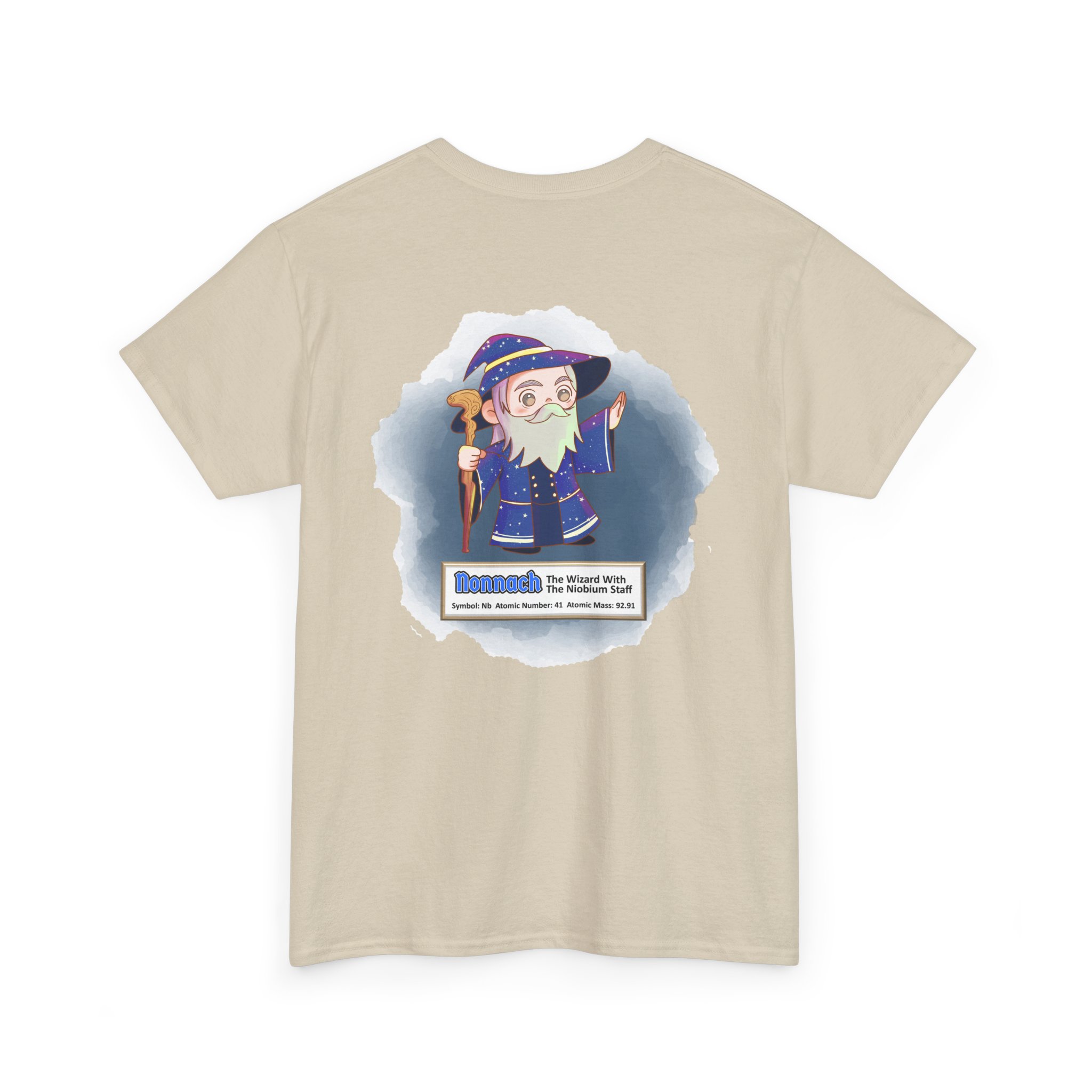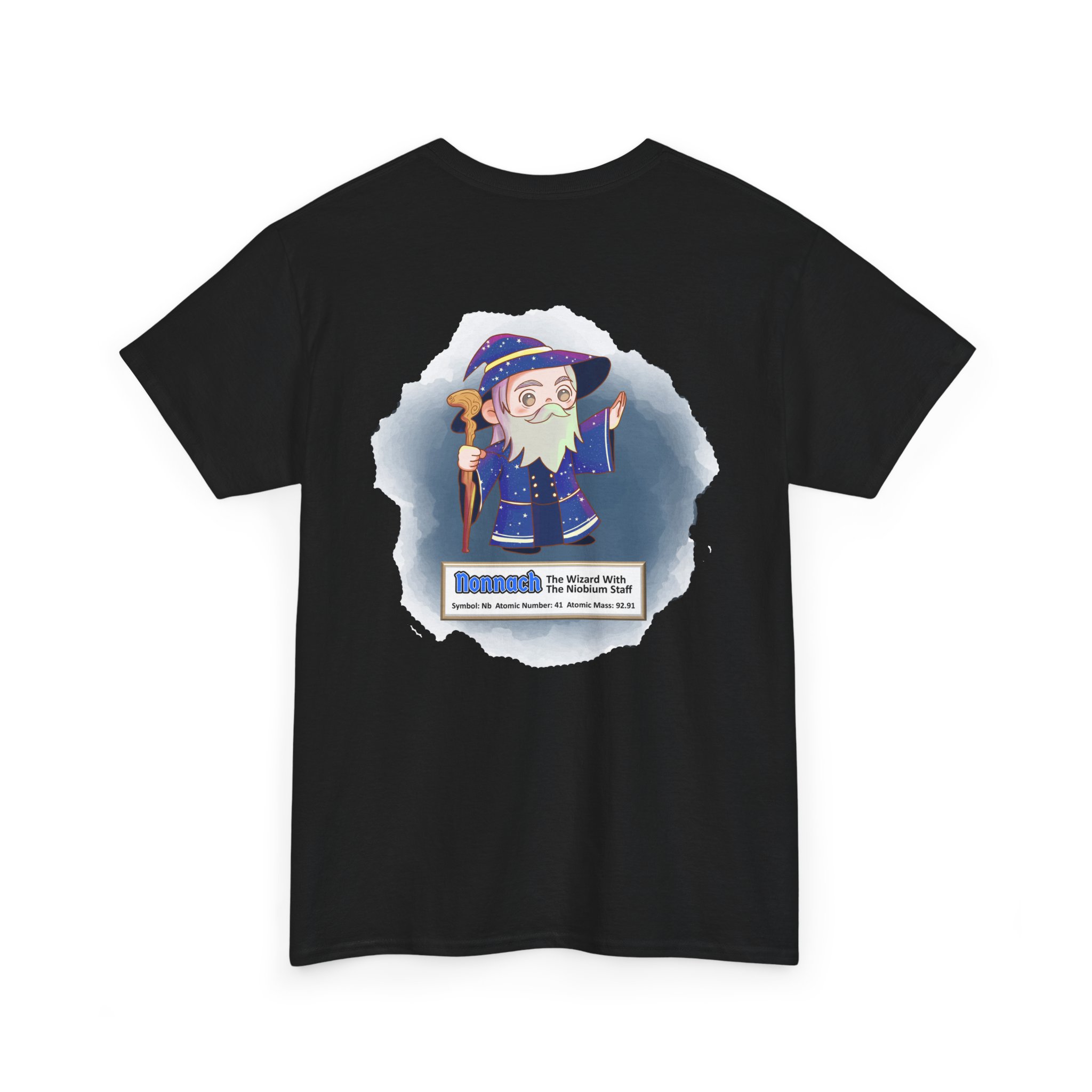 Nonnach Presents Niobium Unisex Tee – Graphic from Magical Elements of the Periodic Table – No Metal No Magic Logo on Front, Nonnach the Wizard on the Back.