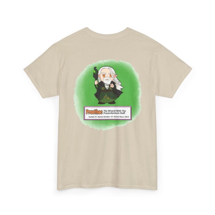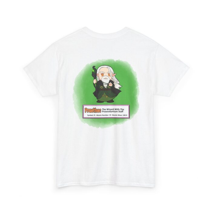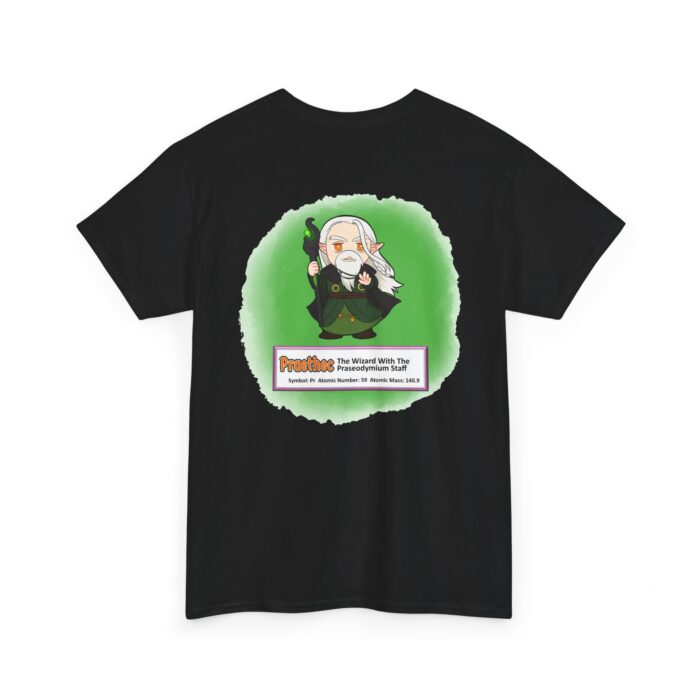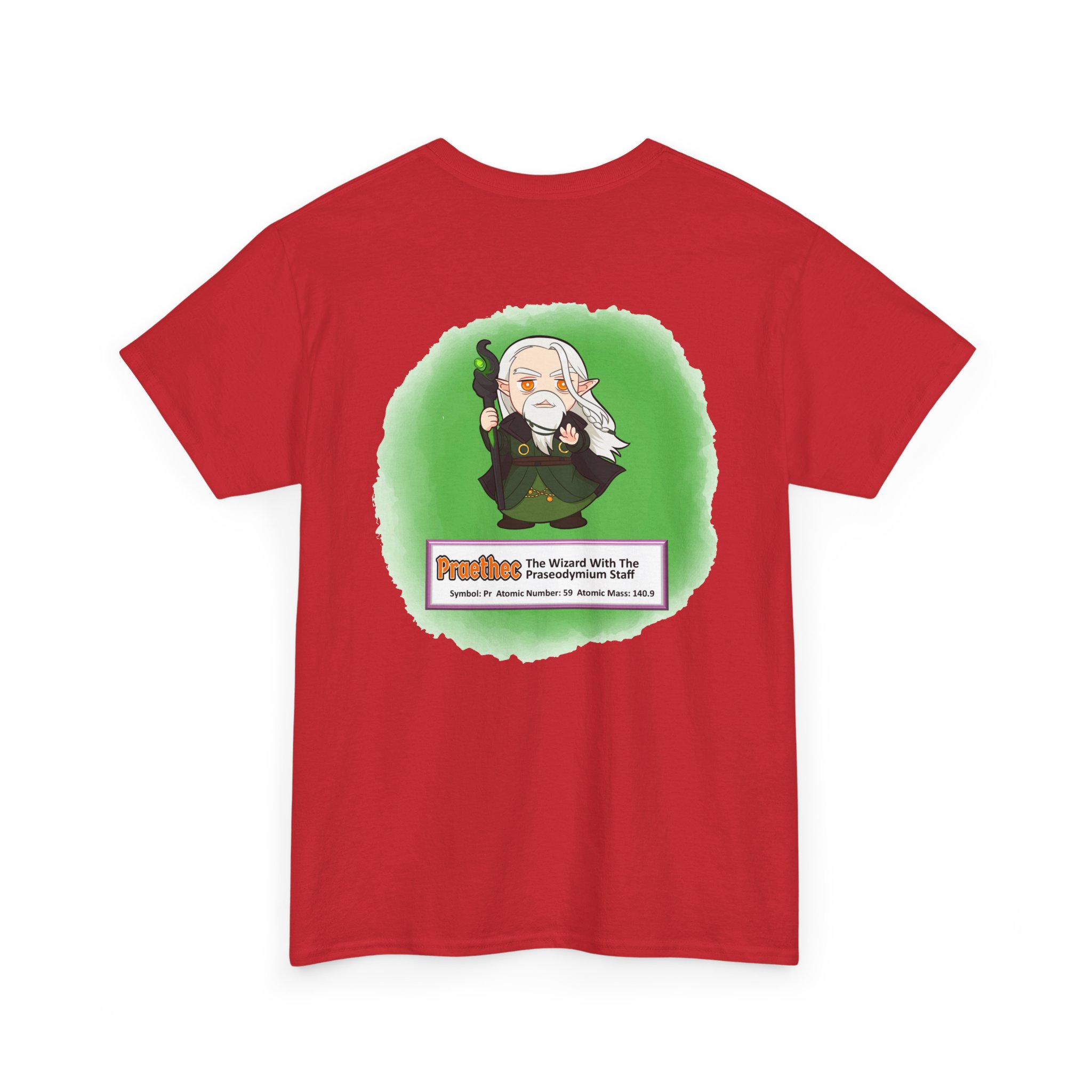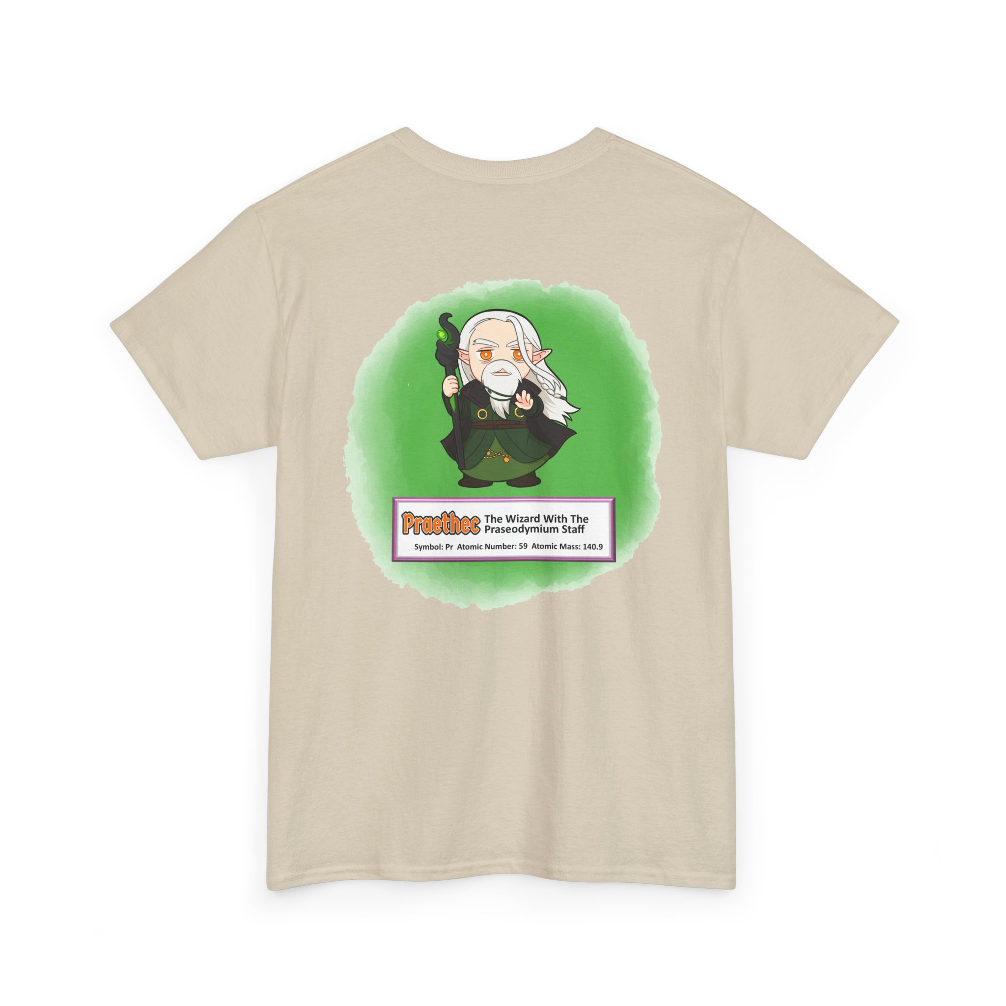 Praethec Presents Praseodymium Unisex Tee – Graphic from Magical Elements of the Periodic Table – No Metal No Magic Logo on Front, Praethec the Wizard on the Back.