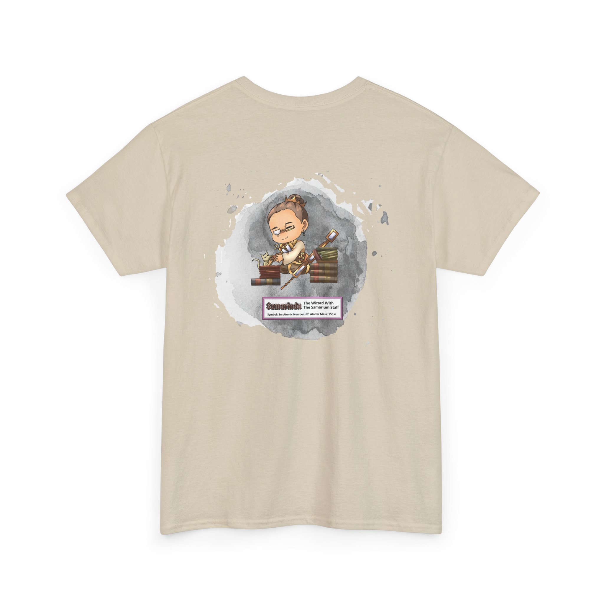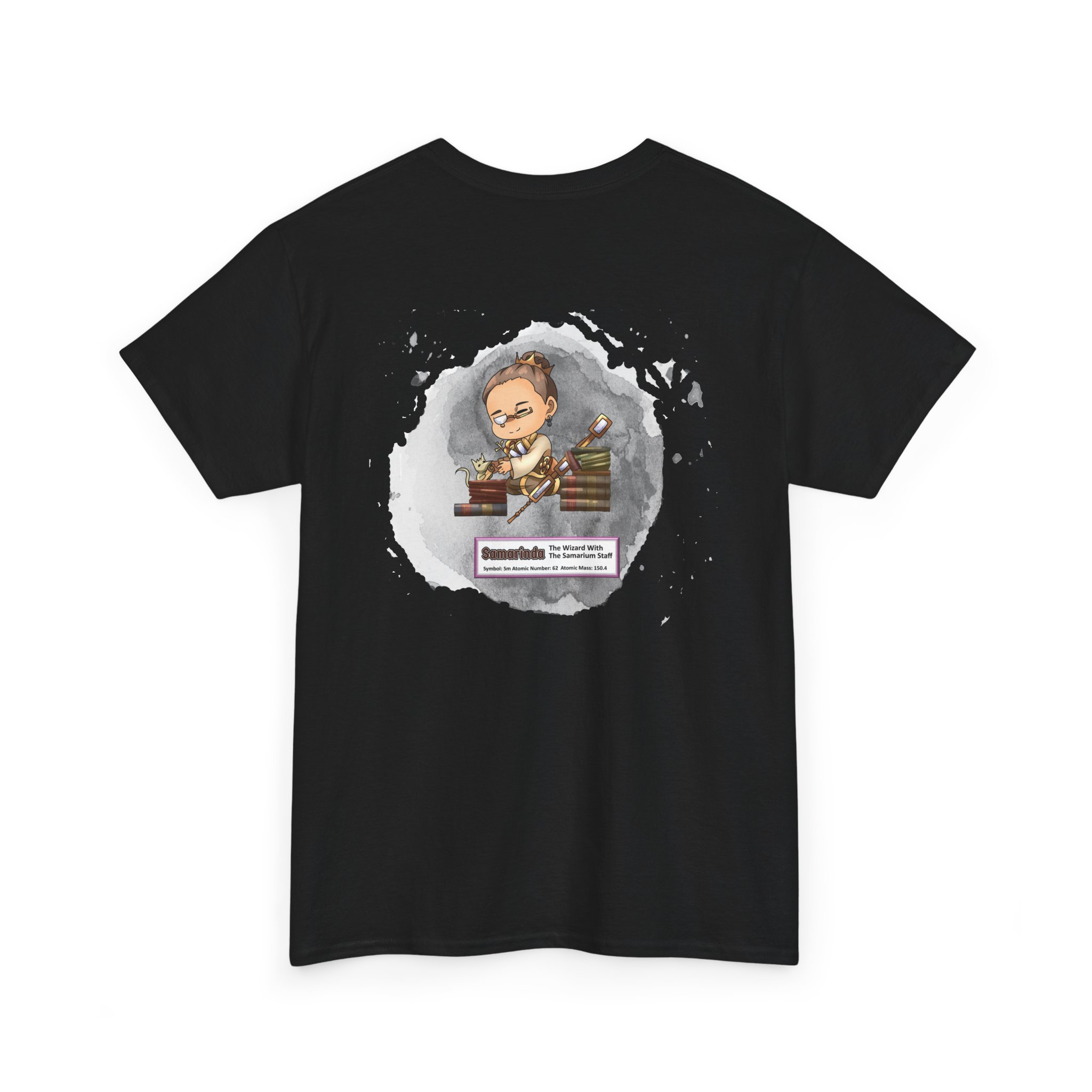 Samarinda Presents Samarium Unisex Tee- Graphic from Magical Elements of the Periodic Table – No Metal No Magic Logo on Front, Samarinda the Wizard on the Back.