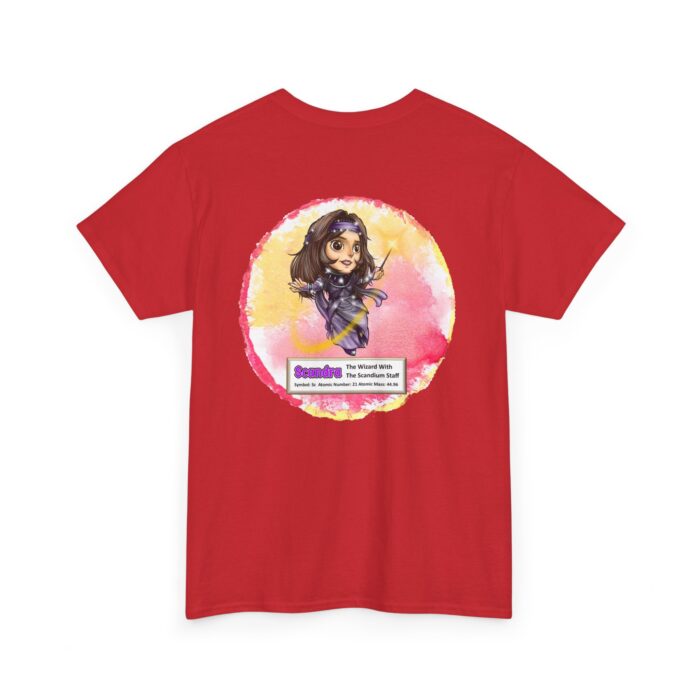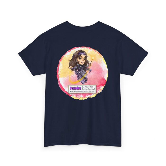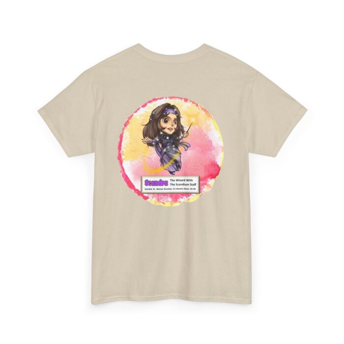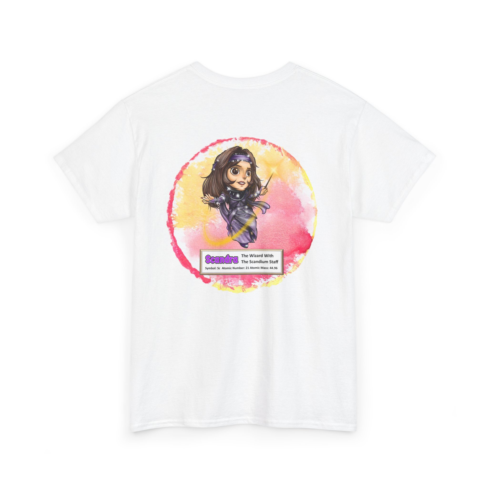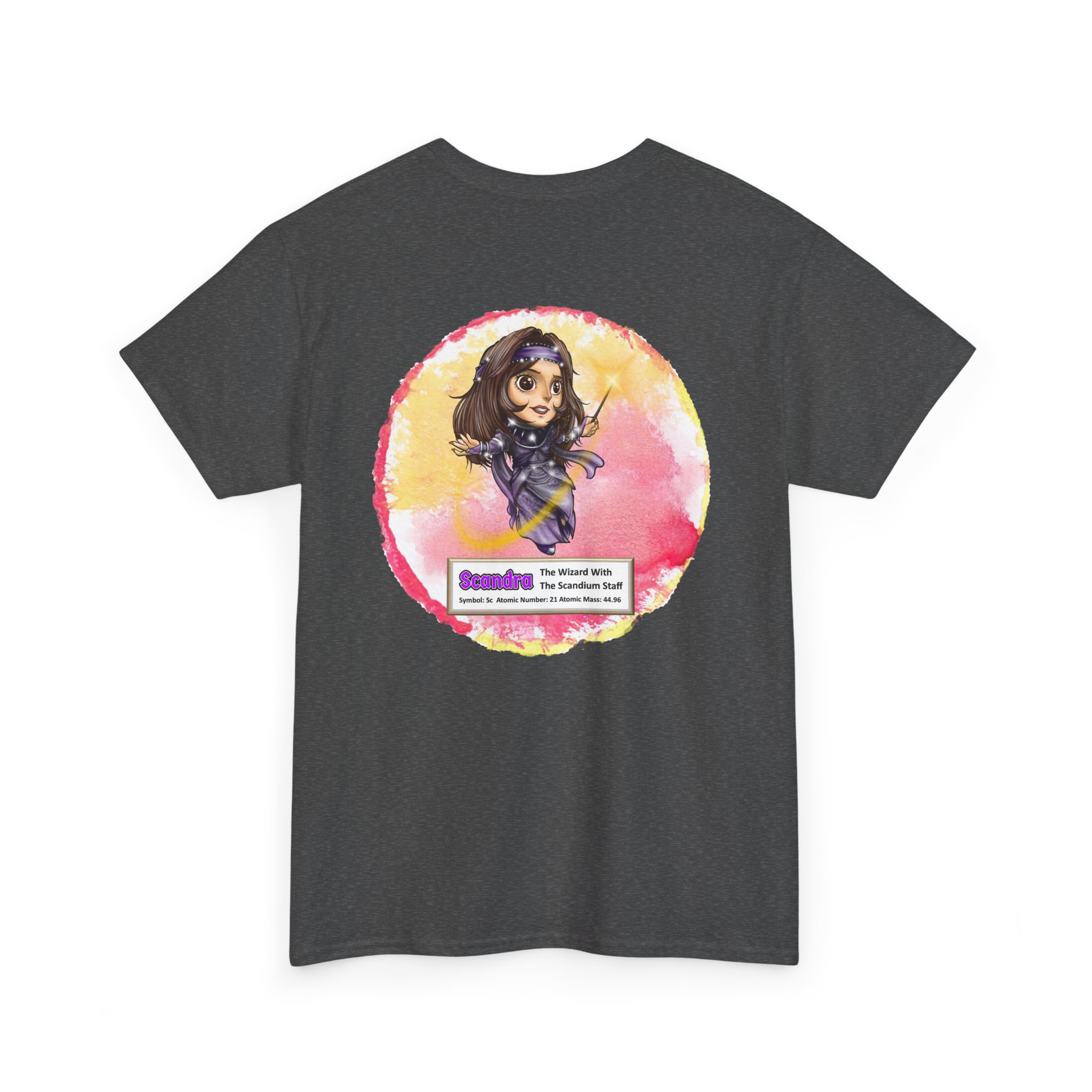 Scandra Presents Scandium Unisex Tee- Graphic from Magical Elements of the Periodic Table – No Metal No Magic Logo on Front, Scandra the Wizard on the Back.