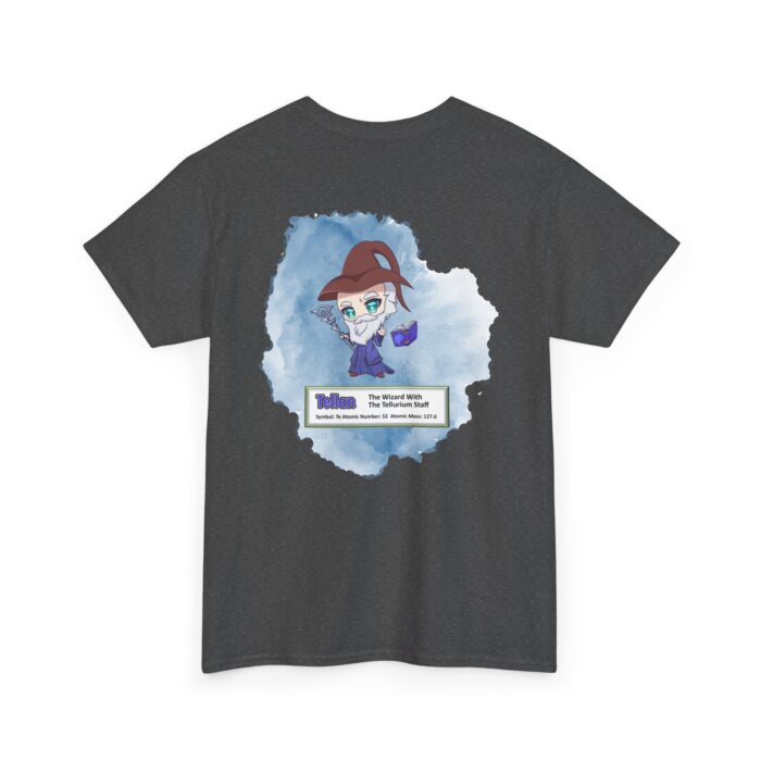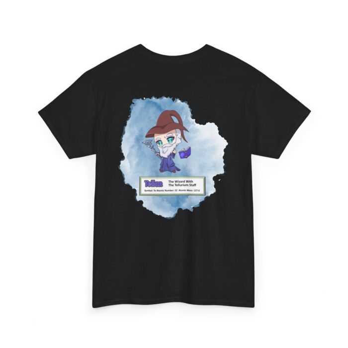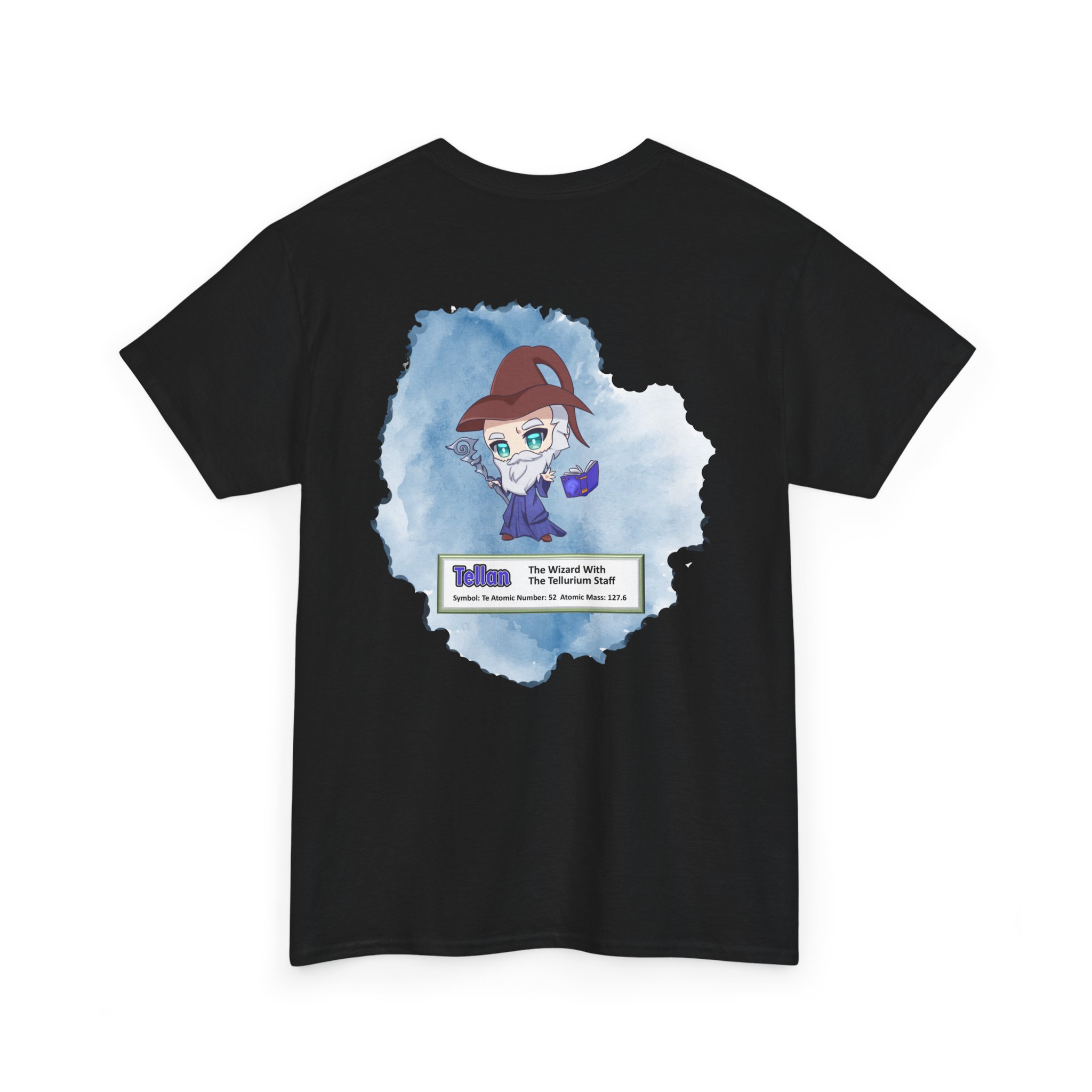 Tellan Presents Tellurium Unisex Tee- Graphic from Magical Elements of the Periodic Table – No Metal No Magic Logo on Front, Tellan the Wizard on the Back.