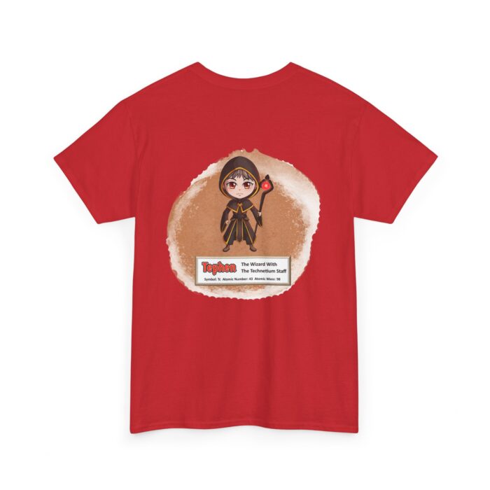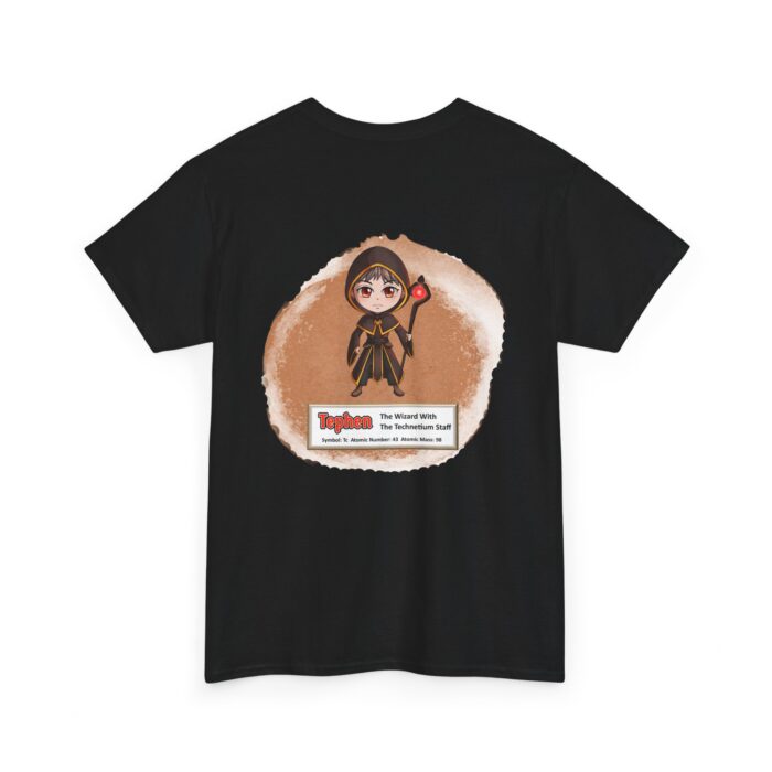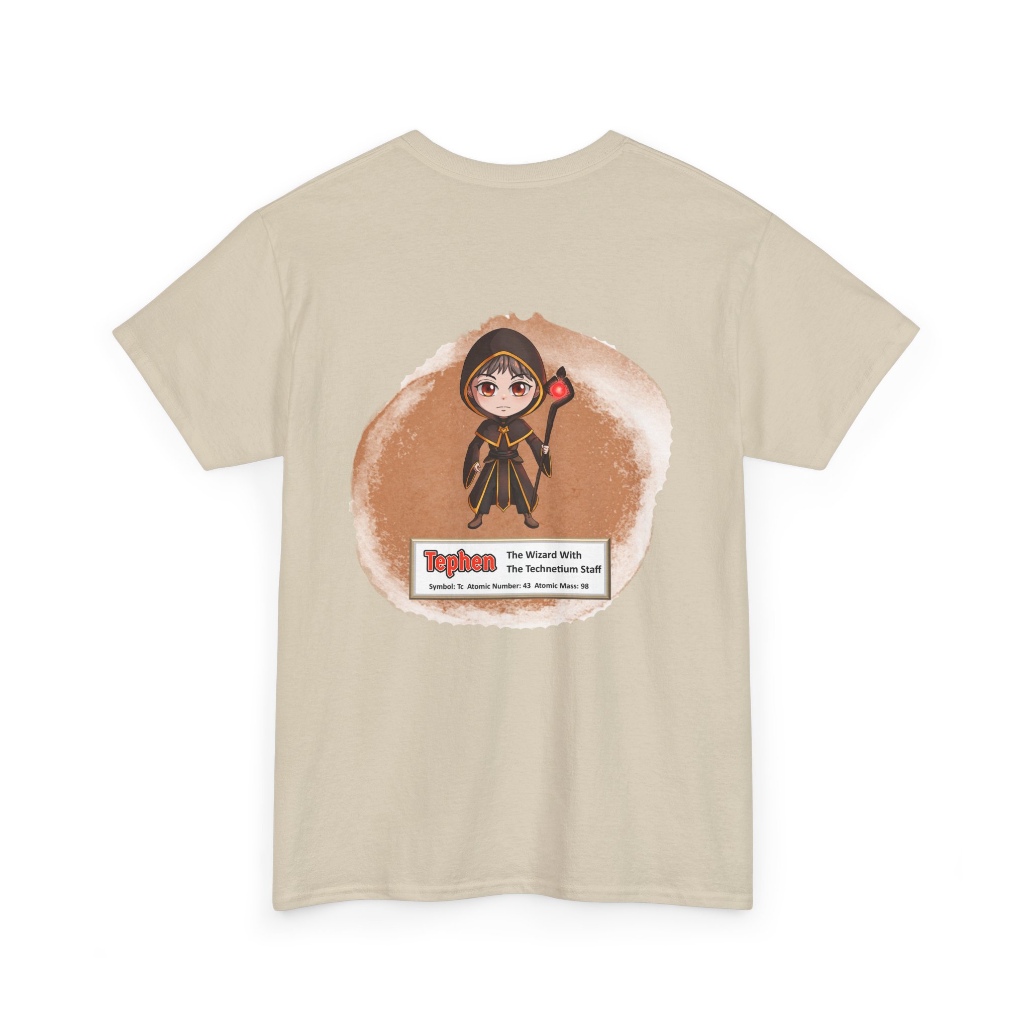 Tephen Presents Technetium Unisex Tee- Graphic from Magical Elements of the Periodic Table – No Metal No Magic Logo on Front, Tephen the Wizard on the Back.