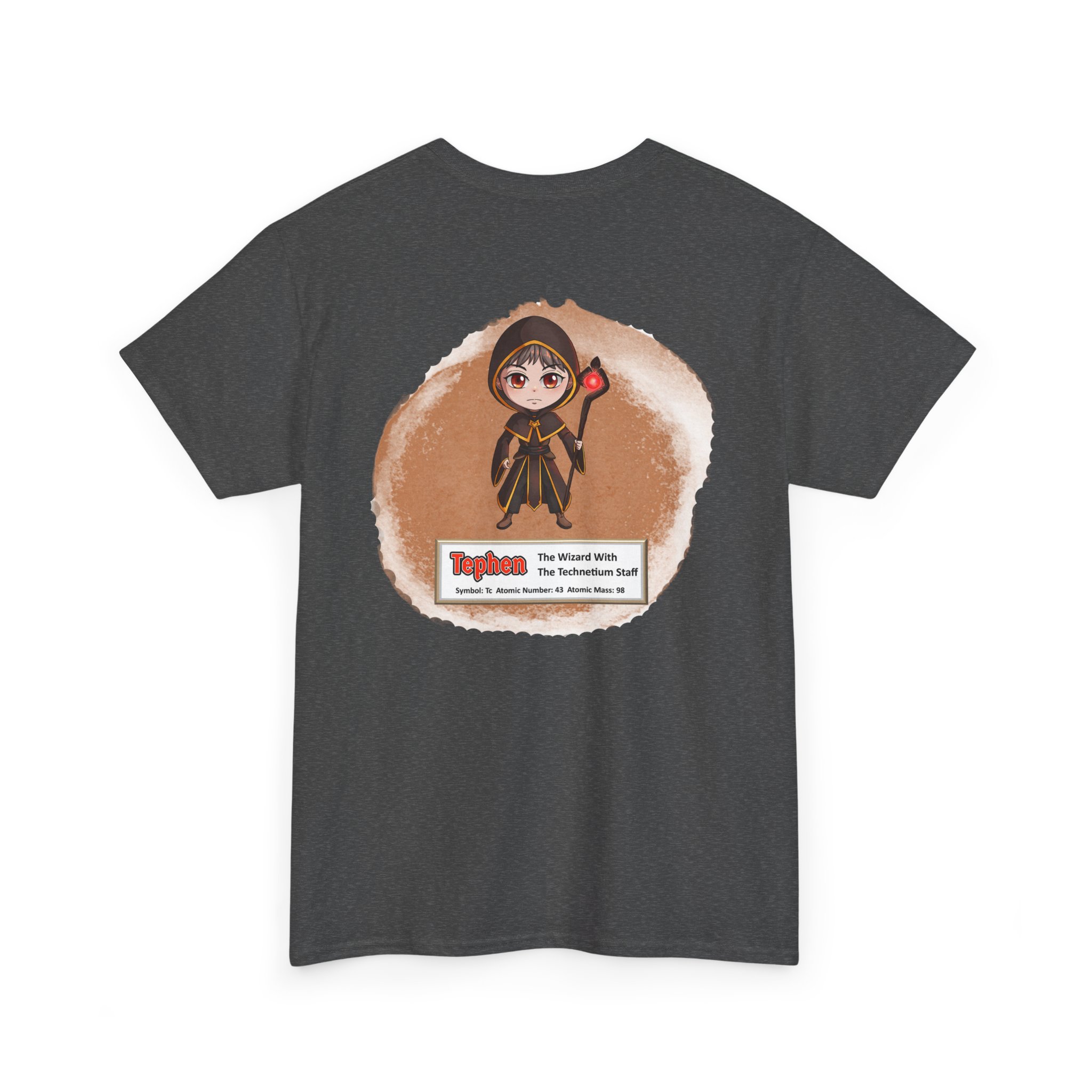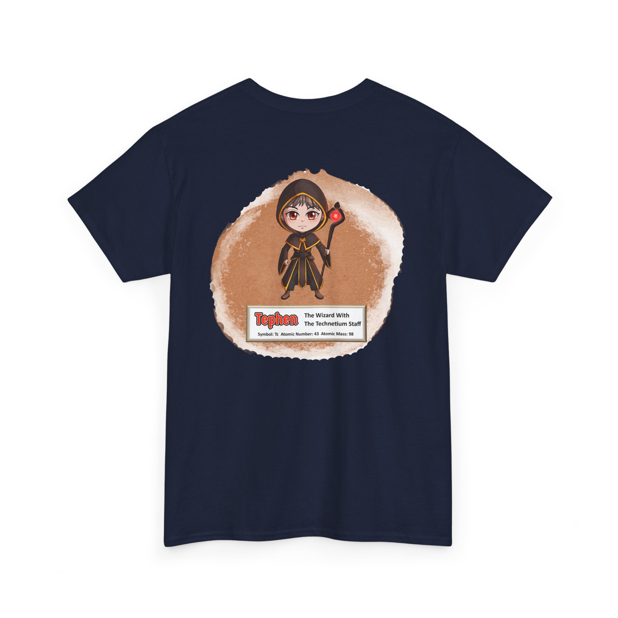 Tephen Presents Technetium Unisex Tee- Graphic from Magical Elements of the Periodic Table – No Metal No Magic Logo on Front, Tephen the Wizard on the Back.