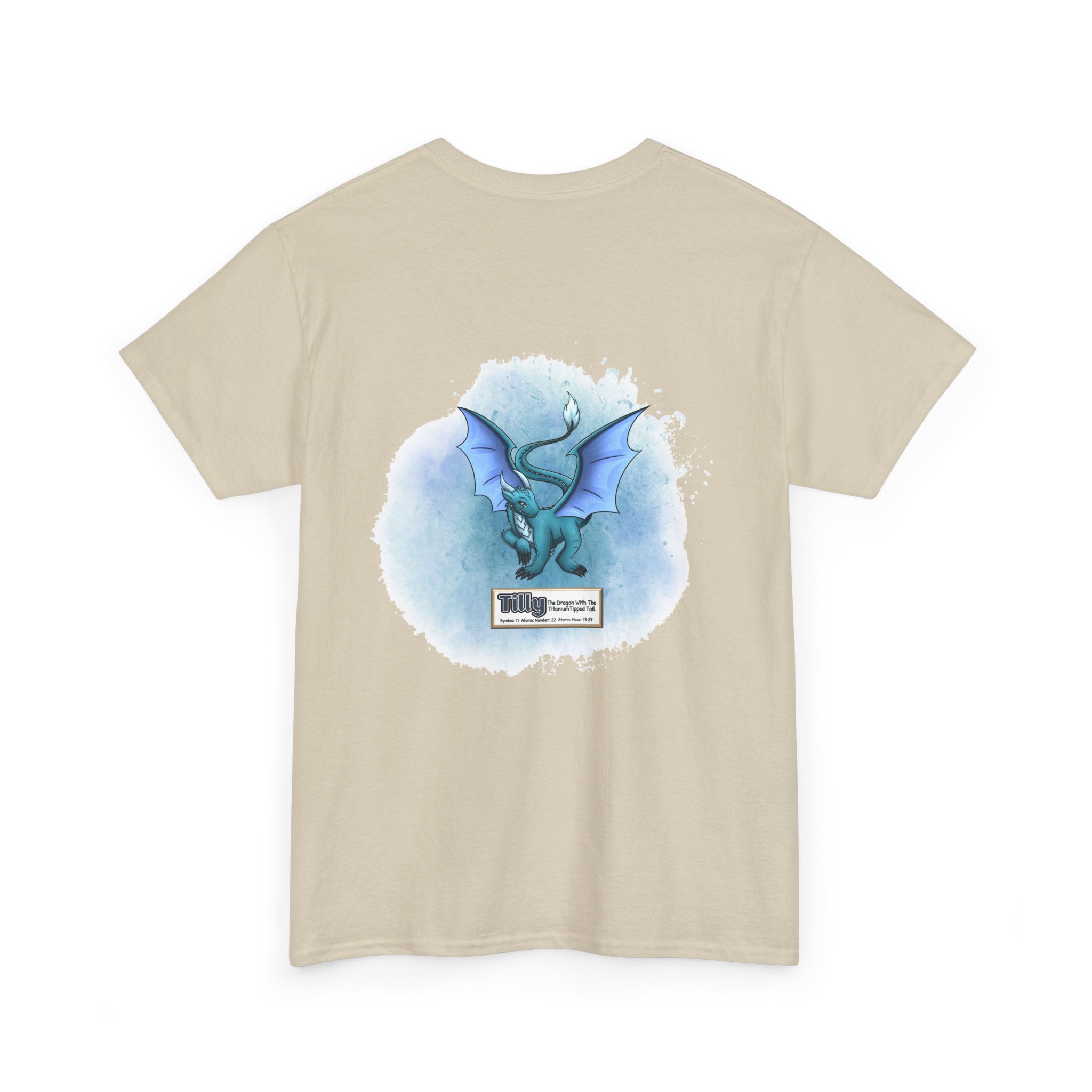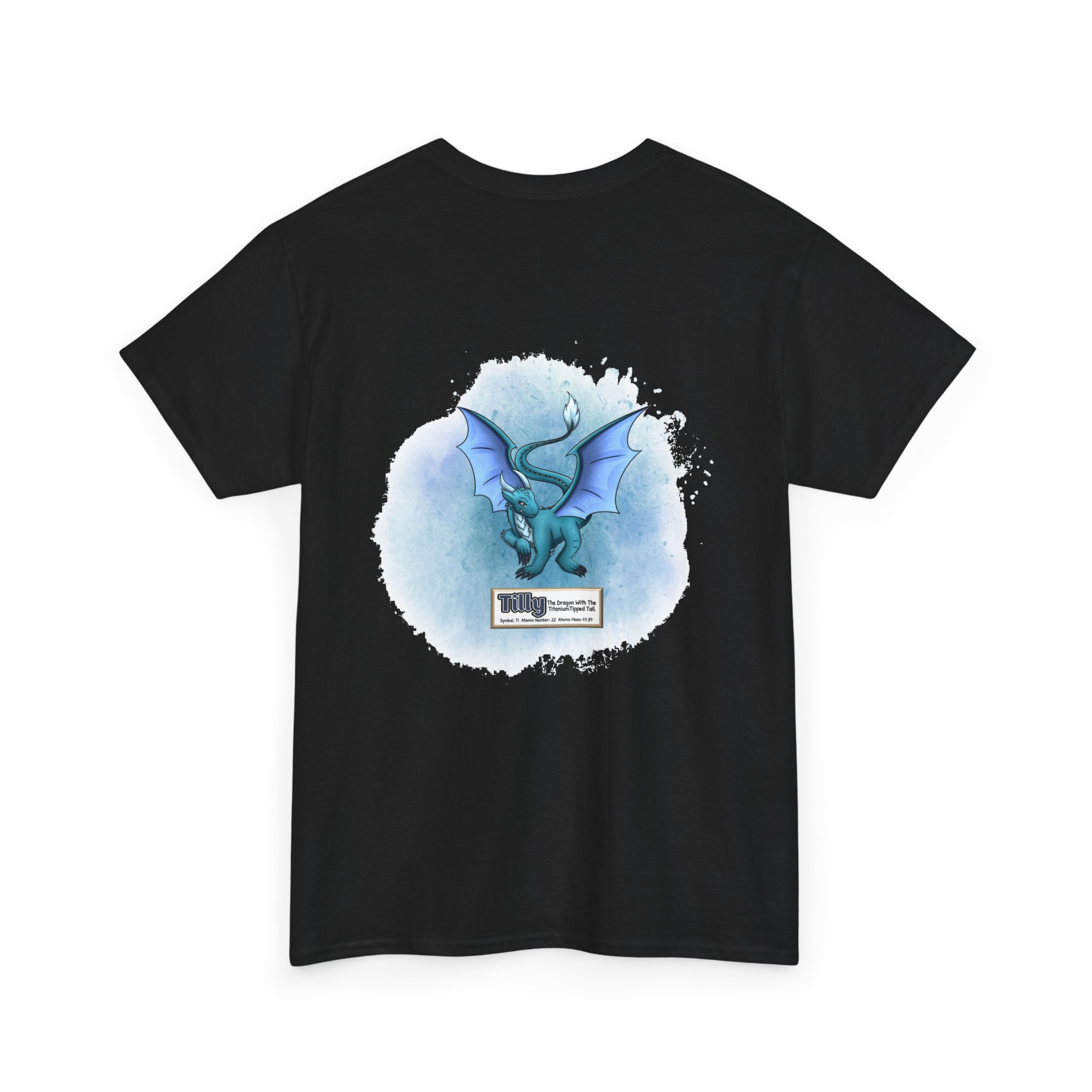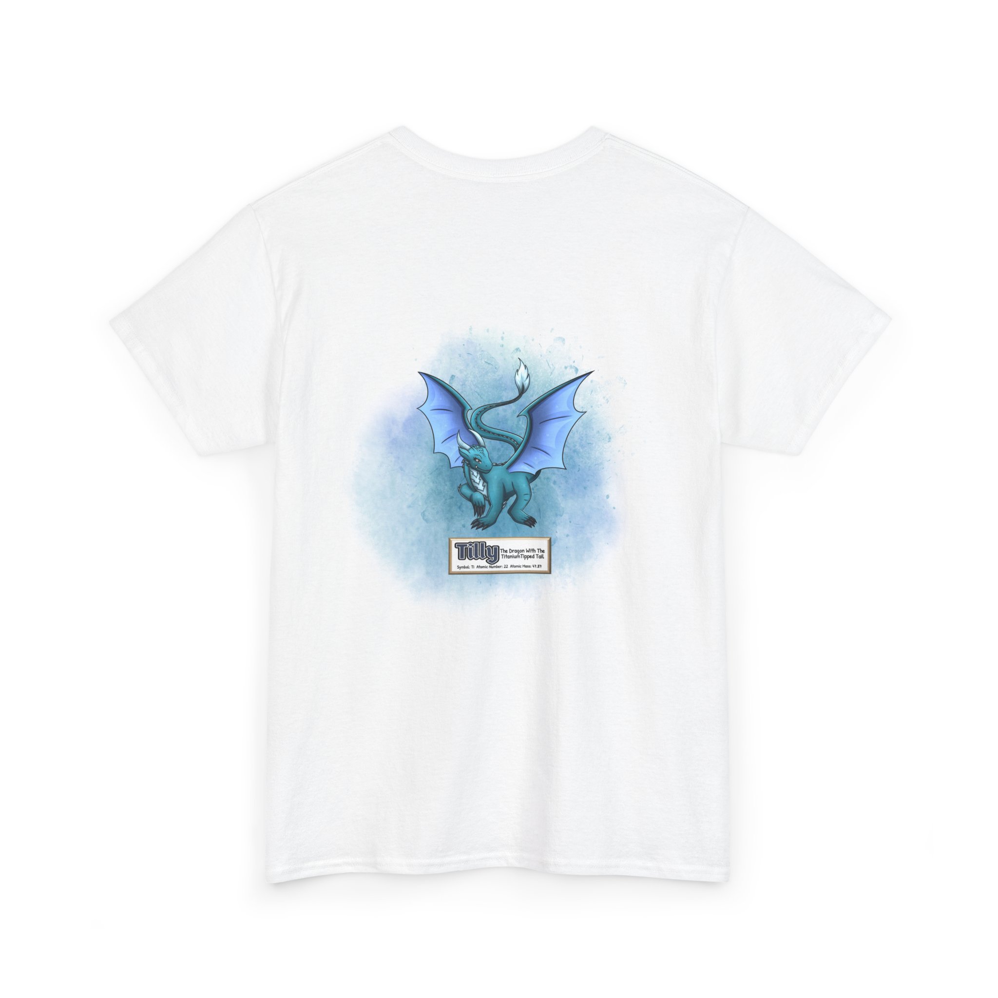 Tilly Presents Titanium Unisex Tee – Graphic from Magical Elements of the Periodic Table – No Metal No Magic Logo on Front, Tilly the Dragon on the Back.