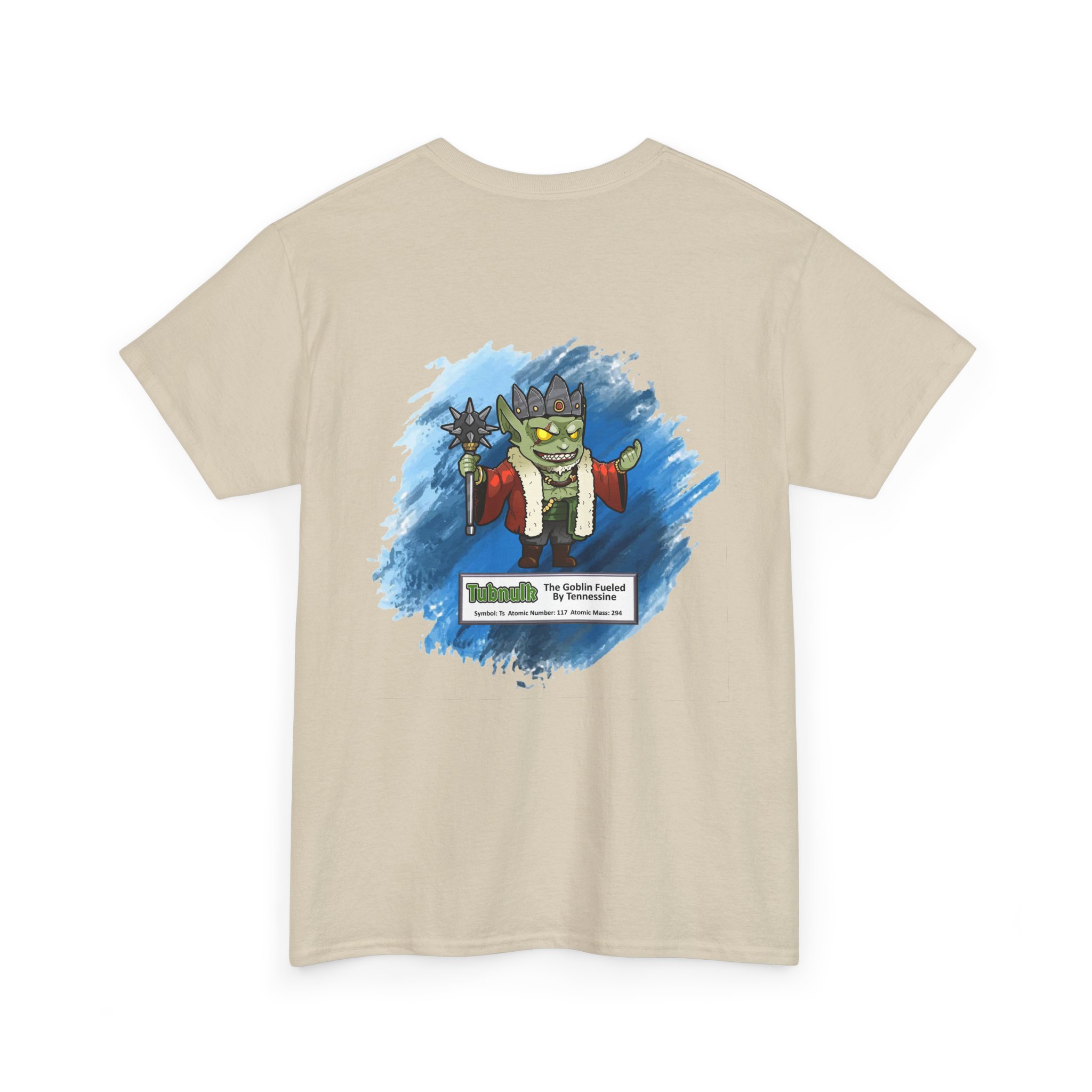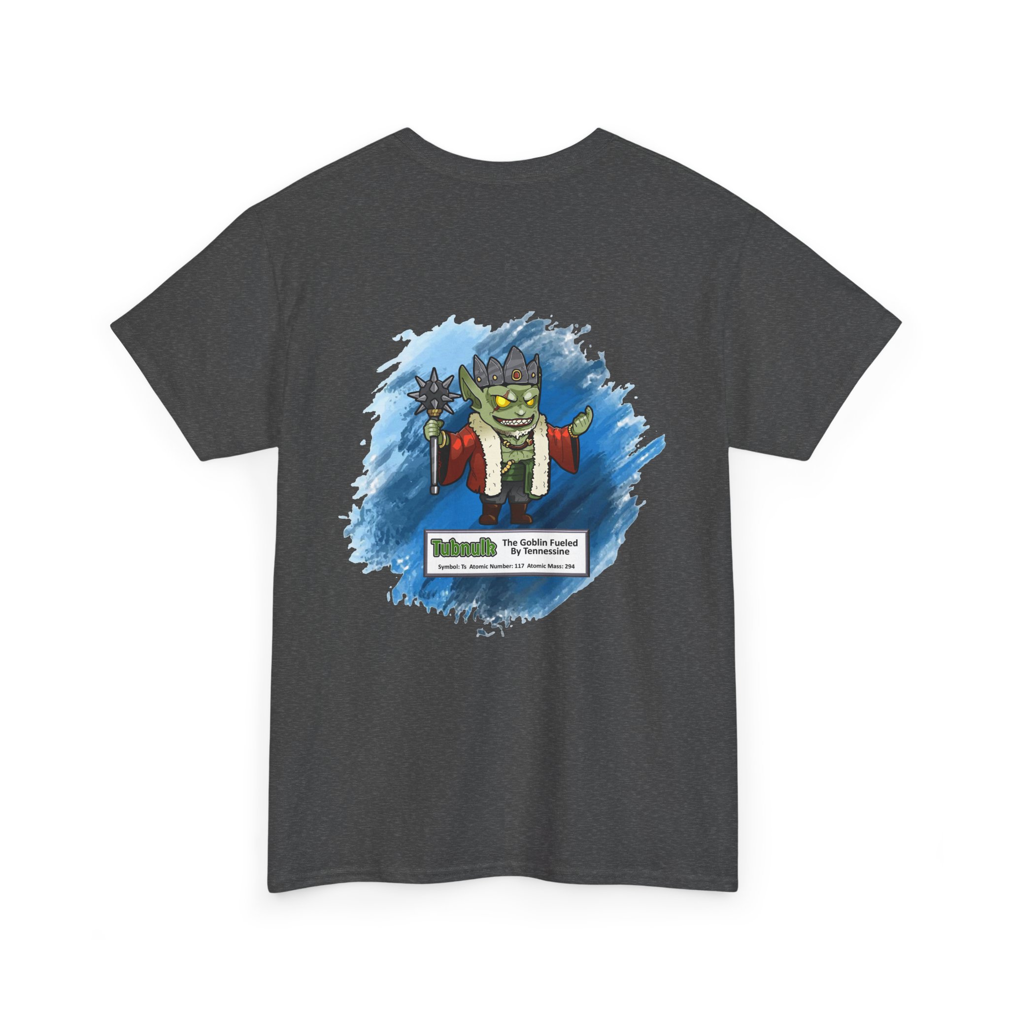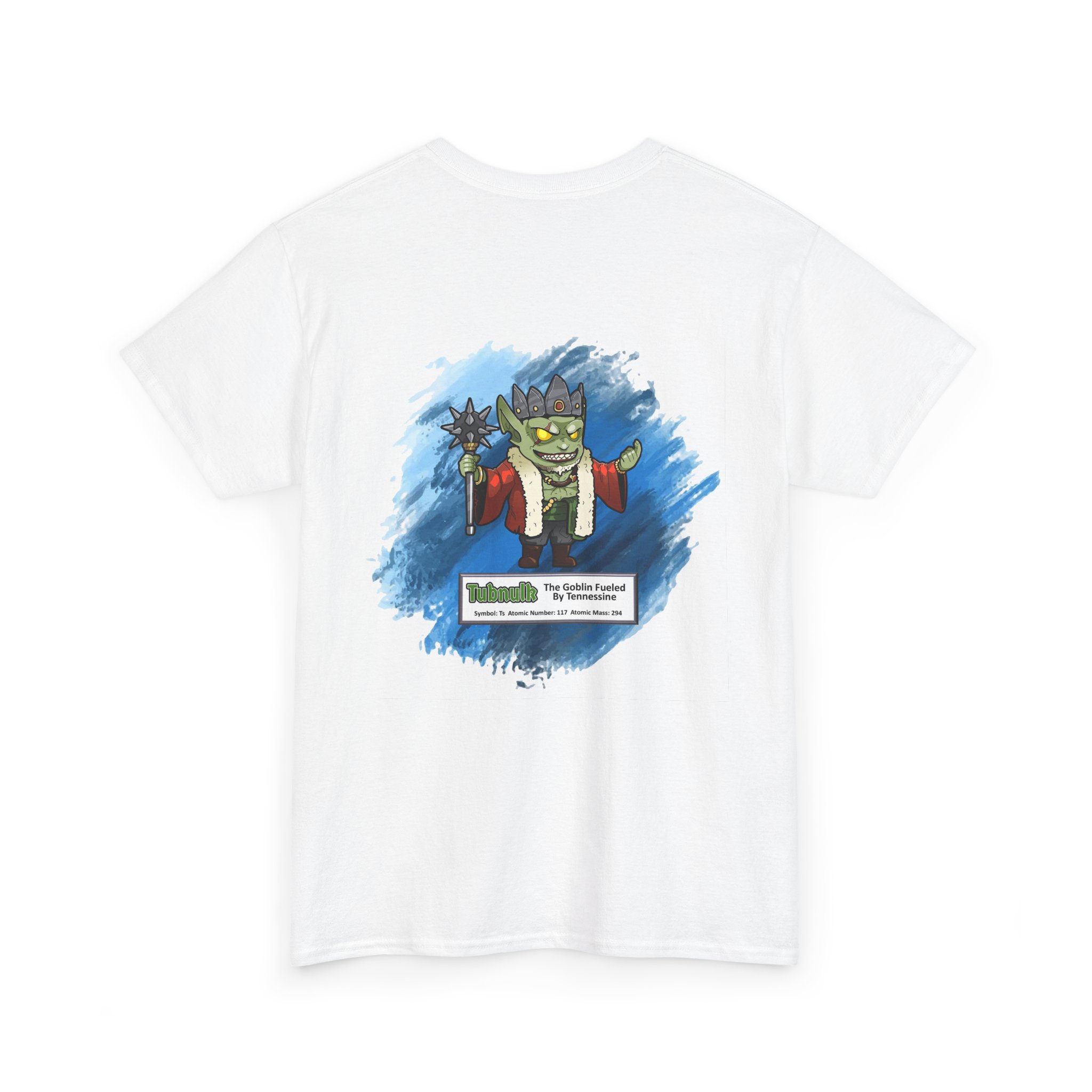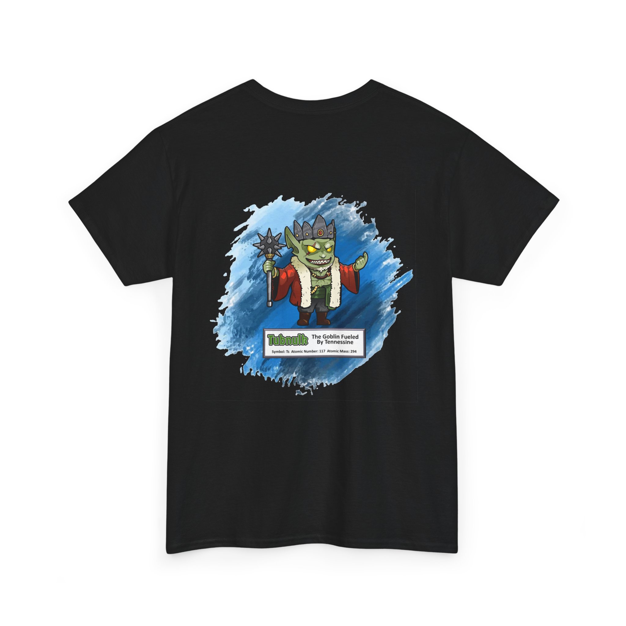 Tubnulk Presents Tennessine Unisex Tee – Graphic from Magical Elements of the Periodic Table – No Metal No Magic Logo on Front, Tubnulk the Goblin on the Back.