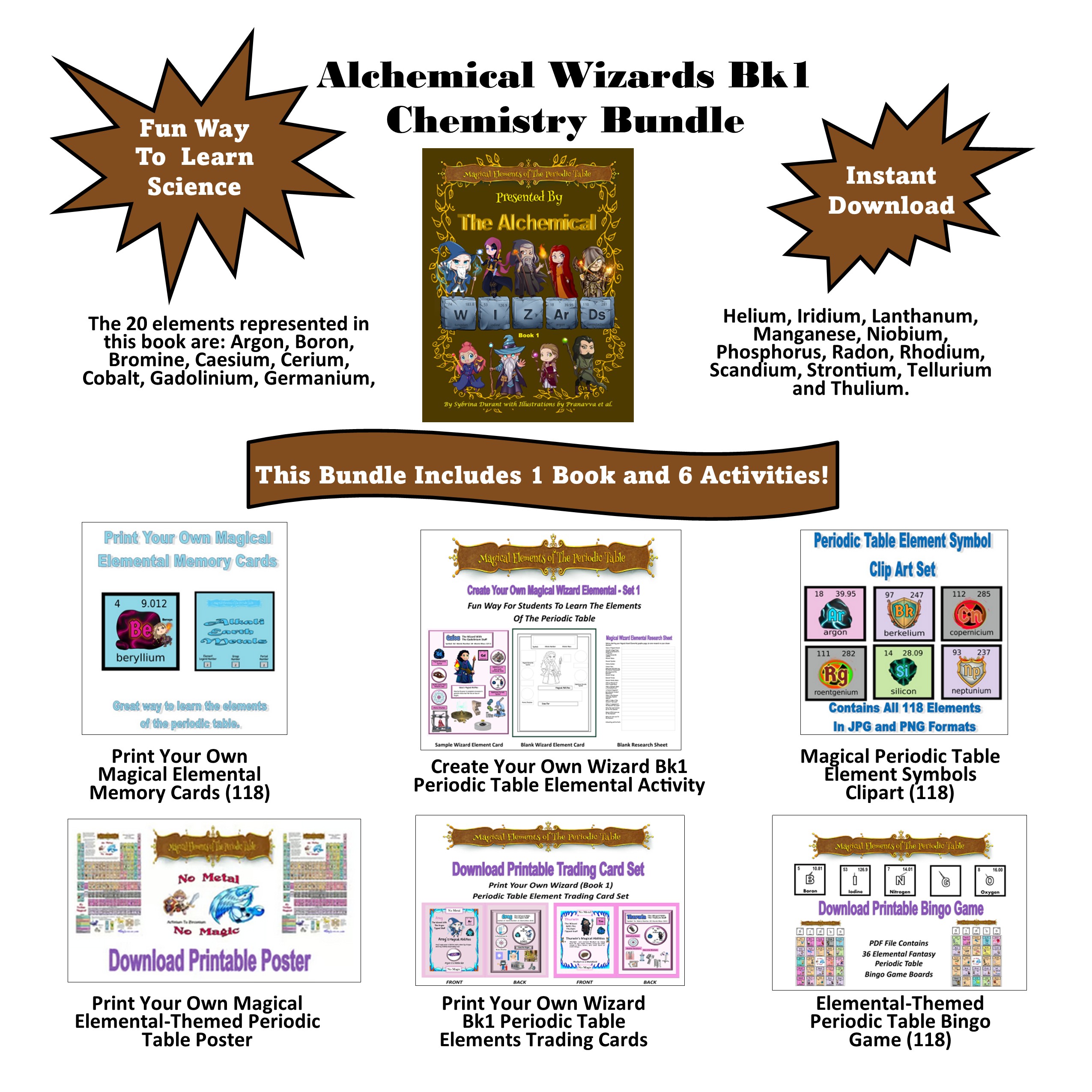 This Print Your Own bundle contains the book titled Magical Elements of the Periodic Table Presented By The Alchemical Wizards Bk 1 plus the Create Your Own Wizards Periodic Table Elements Activity Set plus the Elemental Periodic Table Wizards from Bk 1 Trading Cards and a few other surprises like Memory Cards, Symbol Clip Art, an Elemental Bingo Game and A Free Print Your Own Elemental Periodic Table Poster to help kids have more fun learning about the periodic table.