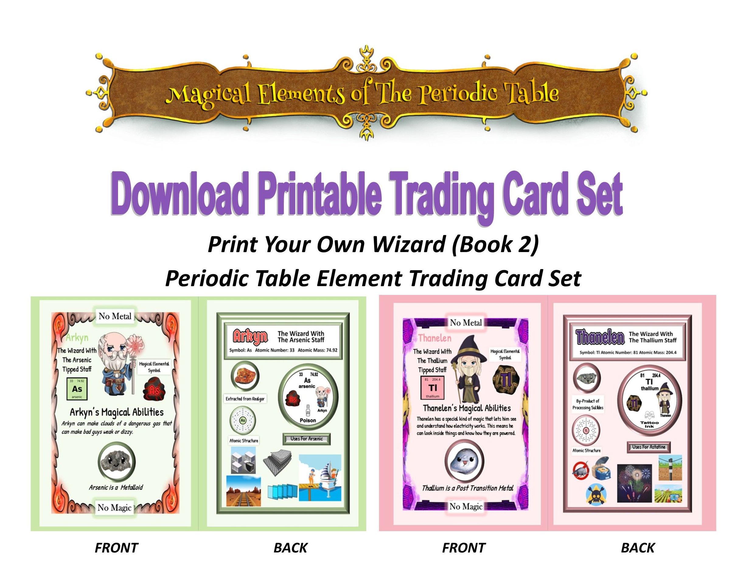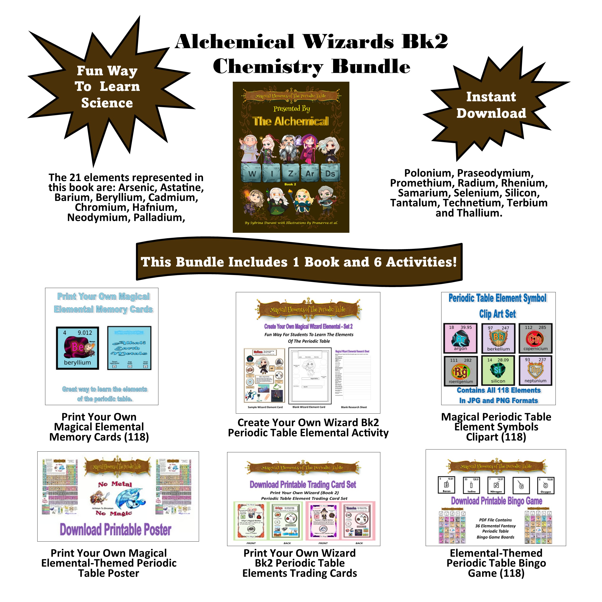 This Print Your Own bundle contains the book titled Magical Elements of the Periodic Table Presented By The Alchemical Wizards Bk 2 plus the Create Your Own Wizards Periodic Table Elements Activity Set plus the Elemental Periodic Table Wizards from Bk 2 Trading Cards and a few other surprises like Memory Cards, Symbol Clip Art, an Elemental Bingo Game and A Free Print Your Own Elemental Periodic Table Poster to help kids have more fun learning about the periodic table.