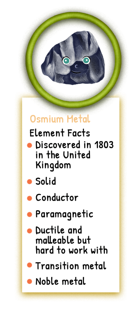 This article is brought to you by Sybrina Durant, the author of the middle grade picture book, Magical Elements of the Periodic Table Presented Alphabetically By The Metal Horn Unicorns. Learn More. In that book Osmium is presented by the unicorn, Osm. Read Osm’s Story.