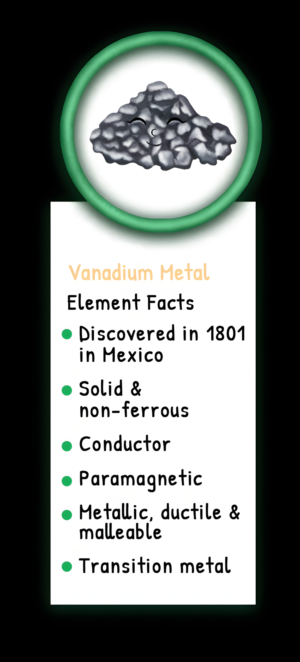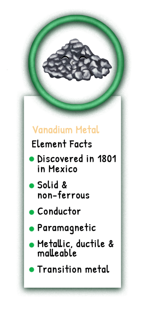 This article is brought to you by Sybrina Durant, the author of the middle grade picture book, Magical Elements of the Periodic Table Presented Alphabetically By The Metal Horn Unicorns. Learn More. In that book Vanadium is presented by the unicorn, Vana. Read Vana’s Story.
