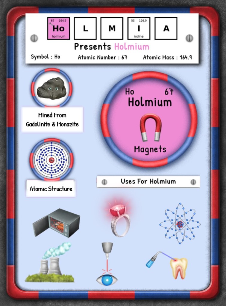 This article is brought to you by Sybrina Durant, the author of the middle grade picture book, Magical Elements of the Periodic Table Presented Alphabetically By The Metal Horn Unicorns. Learn More. In that book Holmium is presented by the unicorn, Holmia. Read Holmia’s Story.