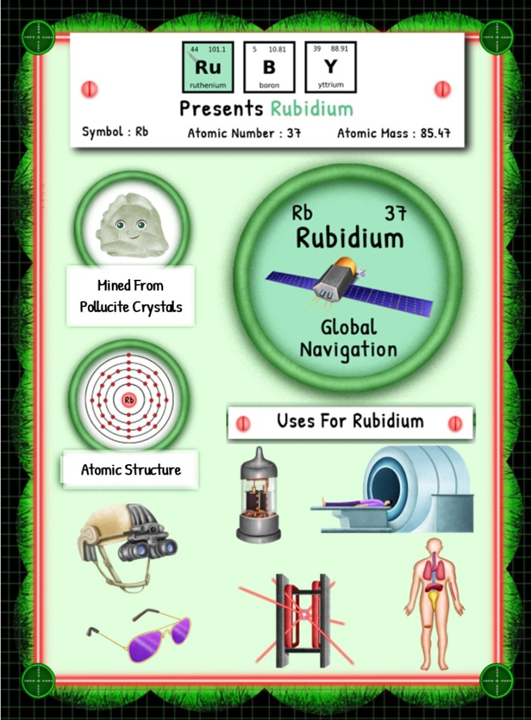 This article is brought to you by Sybrina Durant, the author of the middle grade picture book, Magical Elements of the Periodic Table Presented Alphabetically By The Metal Horn Unicorns. Learn More. In that book Rubidium is presented by the unicorn, Ruby. Read Ruby’s Story.