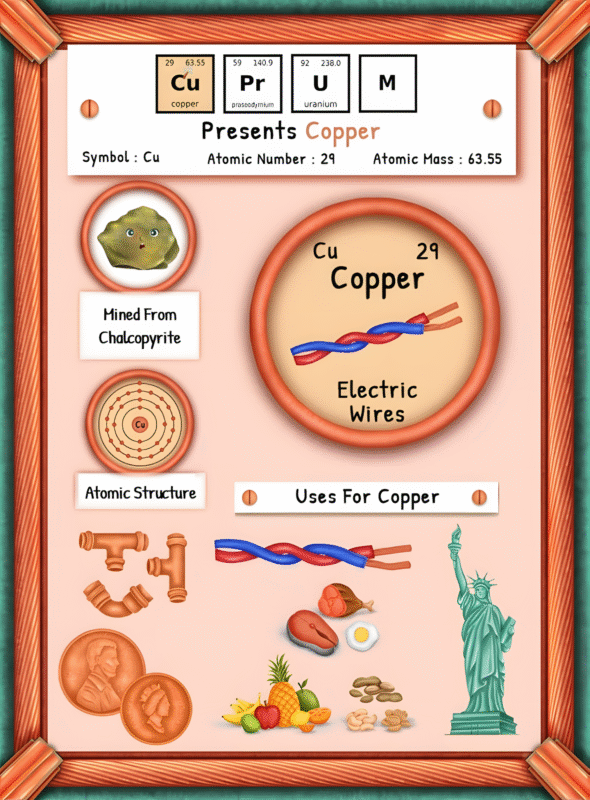 There is one special unicorn in the book whose horn and hooves are an alloy created by combining copper and zinc. Cornum, the Brass Horned unicorn will reveal some interesting things about that metal.